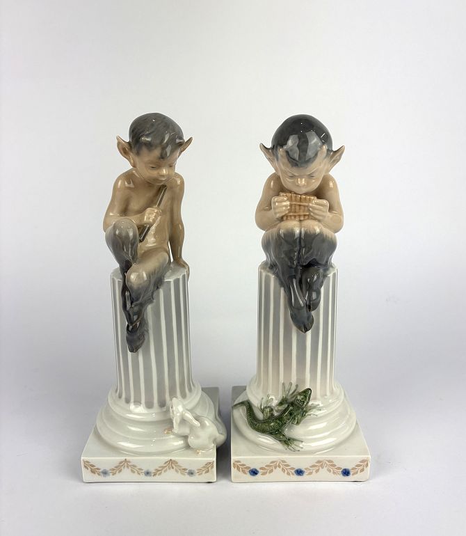 A pair of Royal Copenhagen porcelain models of fauns atop columns, one with lizard no 433 21cm high, and one with rabbit no 456 21.5cm