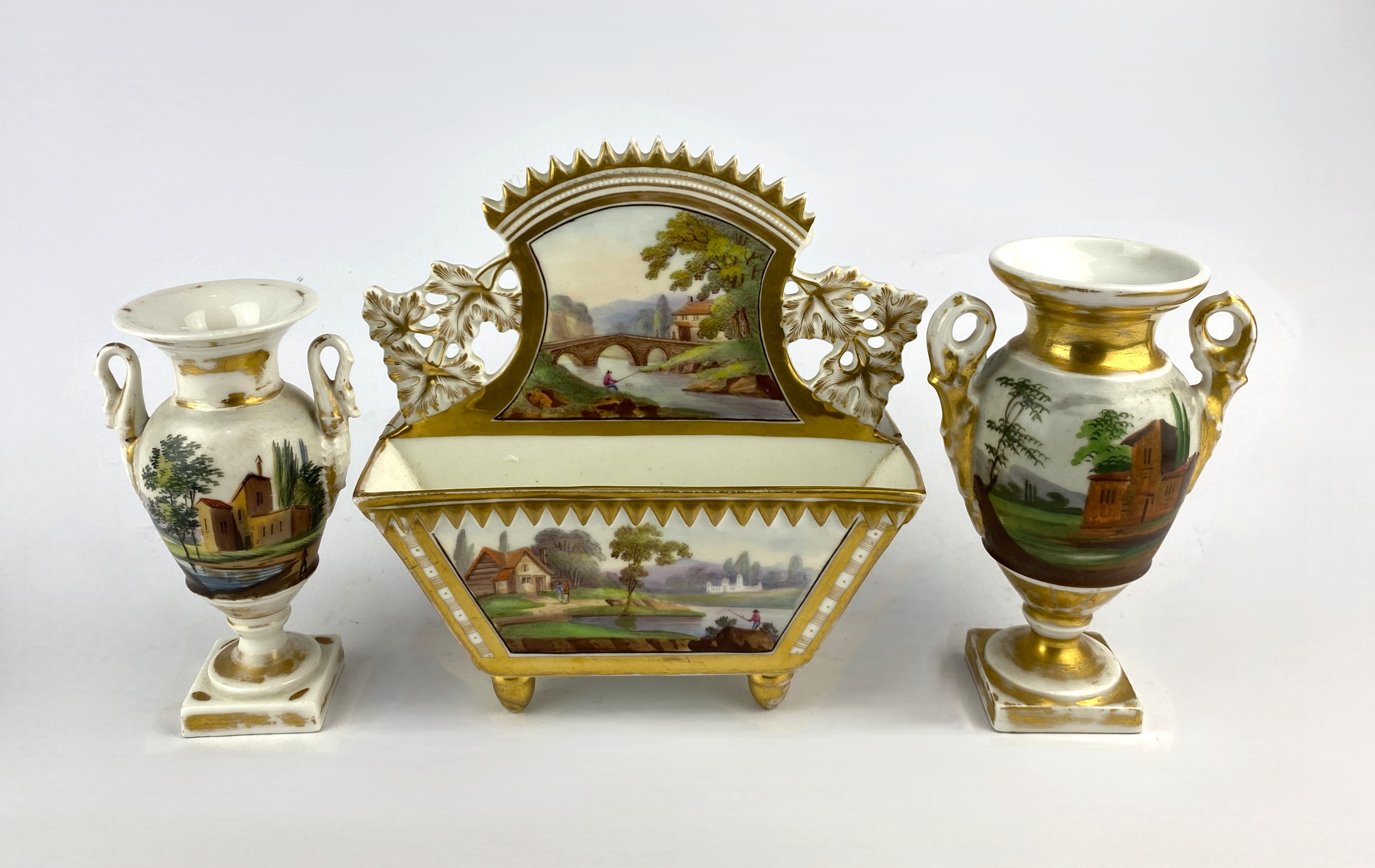 An early 19th century boat shaped porcelain letter rack painted with scenic landscape views, no makers marks, 18cm high, a French porcelain miniature urn 14.5cm, and another similar (a/f)
