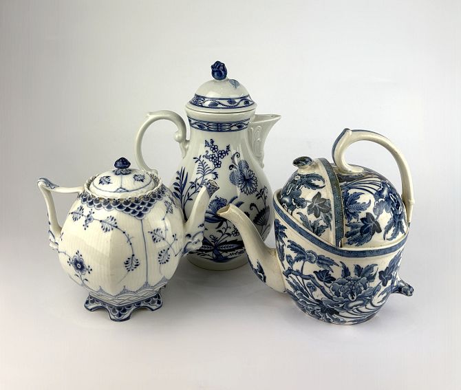 A Royal Copenhagen porcelain teapot, the fluted body of shaped form, bearing number '1118' and manufactures marks to base, decorated with fauna and scale pattern, (lid AF), height 16.5cm, a Bavarian pattern porcelain coffee pot, height 25cm; a Wedgwood 'Peony' pattern blue and white transfer printed teapot, bearing impressed marks to base 'Patent S.Y.P Wedgwood'lid marked to underside 'The Patent S.Y.P. teapot, 6 Strand on the Green, Chiswick, London' (AF) (3)