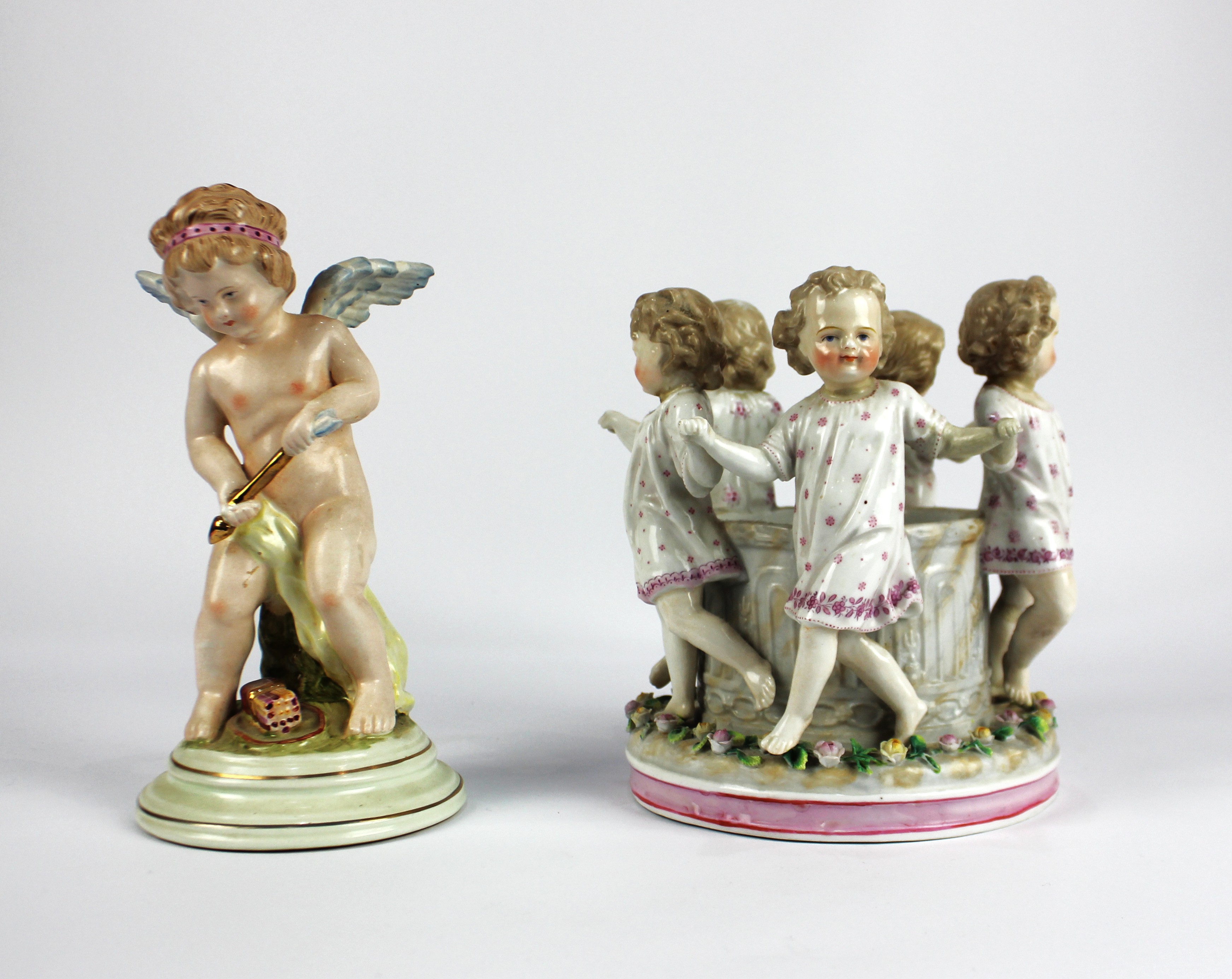 An Ernest Bohne & Sohne porcelain figural vase, in the form of children around a well, impressed 'EBS', height 18cm (AF), together with a Meissen style porcelain figure of winged cupid with a quiver of arrows, bearing a Sevres style underglazed blue mark to base, height 21cm (2) (AF)