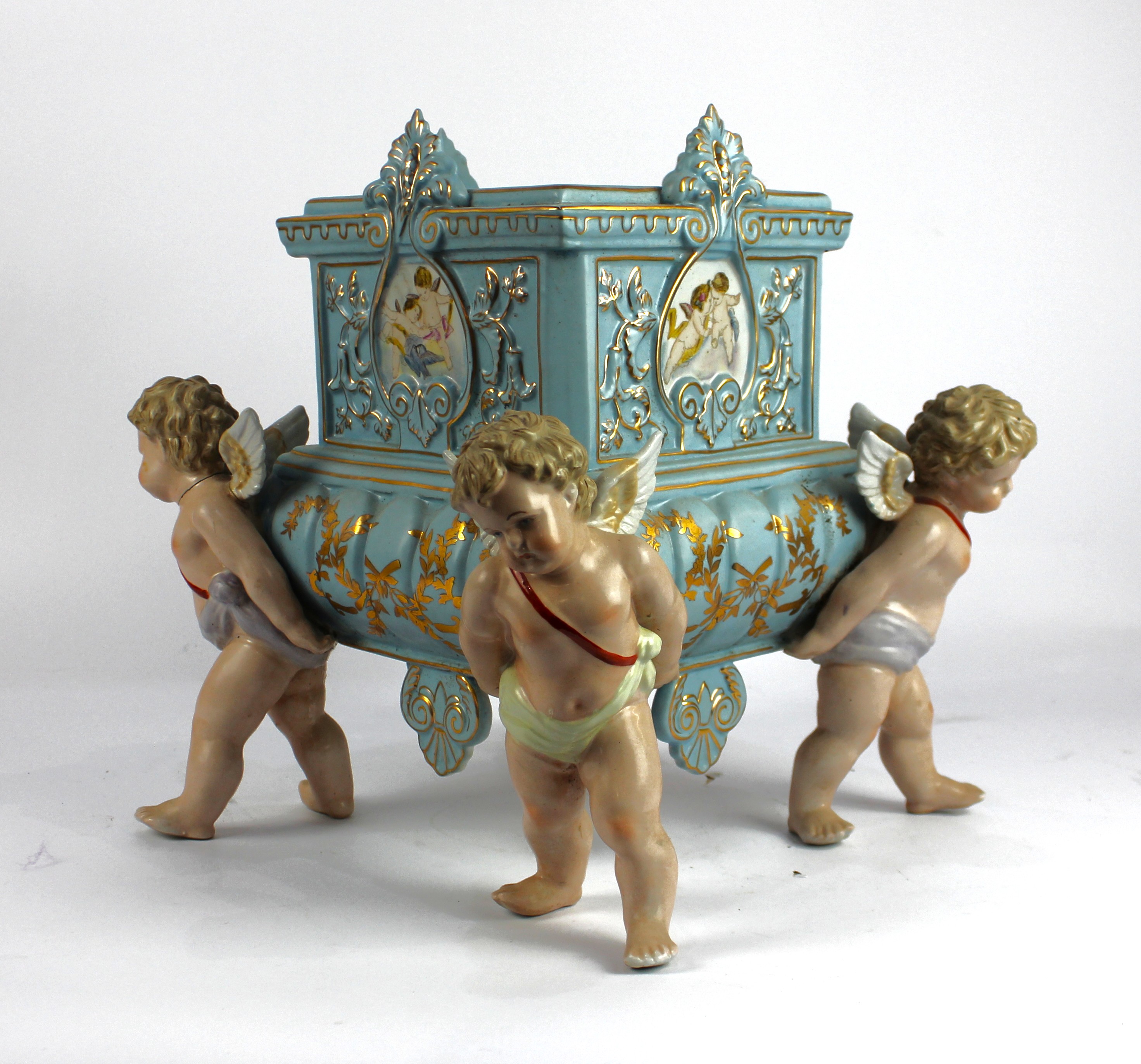 A continental porcelain jardiniere, of square form, blue ground decorated with panels of cherubs, gilt heightened, with supports modelled as cherubs holding the planter aloft, height 33cm (AF)