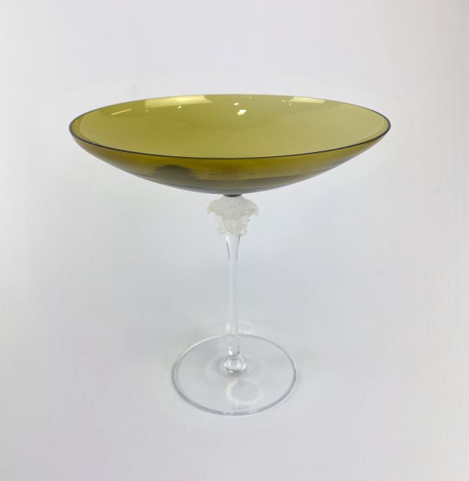 A Rosenthal Versace Medusa Lumiere footed candy dish with coloured glass bowl and frosted Medusa head stem, 21cm high, with box