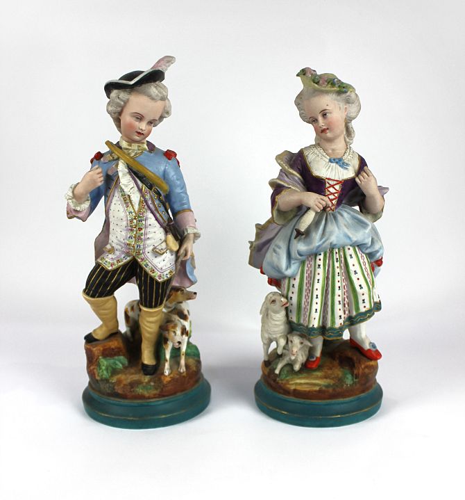 A pair of continental bisque porcelain figures of hunter and a shepherdess, 20th century in the 18th century style, bearing impressed mark '267 L&M', height 36cm (2) (AF)