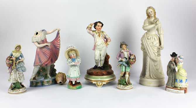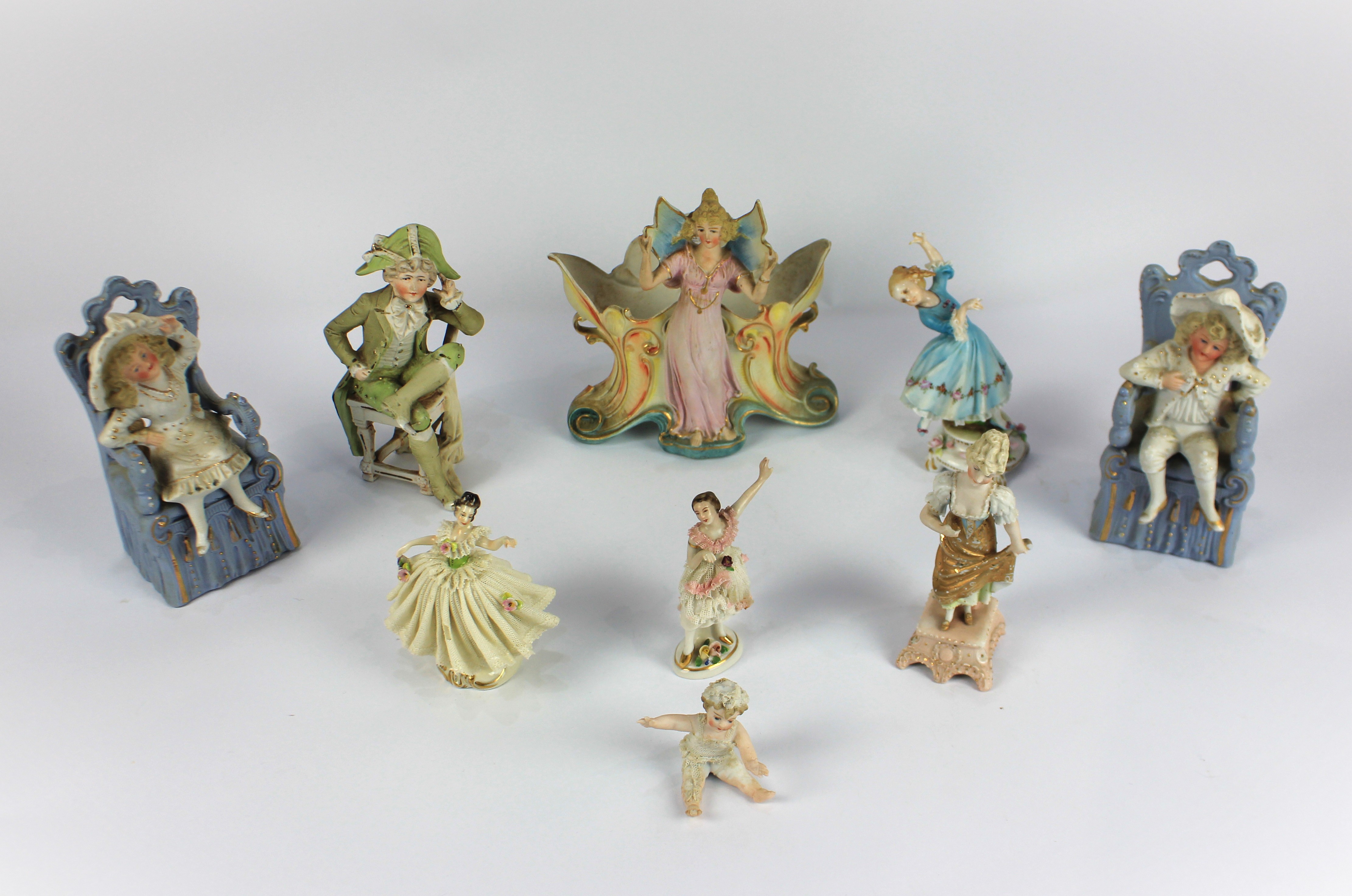 A pair of continental figures of a male and female, each holding a basket of flowers and game, 20th century in the 18th century style, height 19cm, together with further mixed collection of fourteen porcelain and bisque porcelain figures and figure groups (16) (AF)