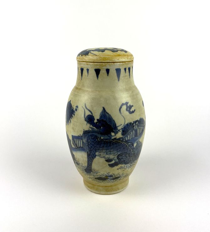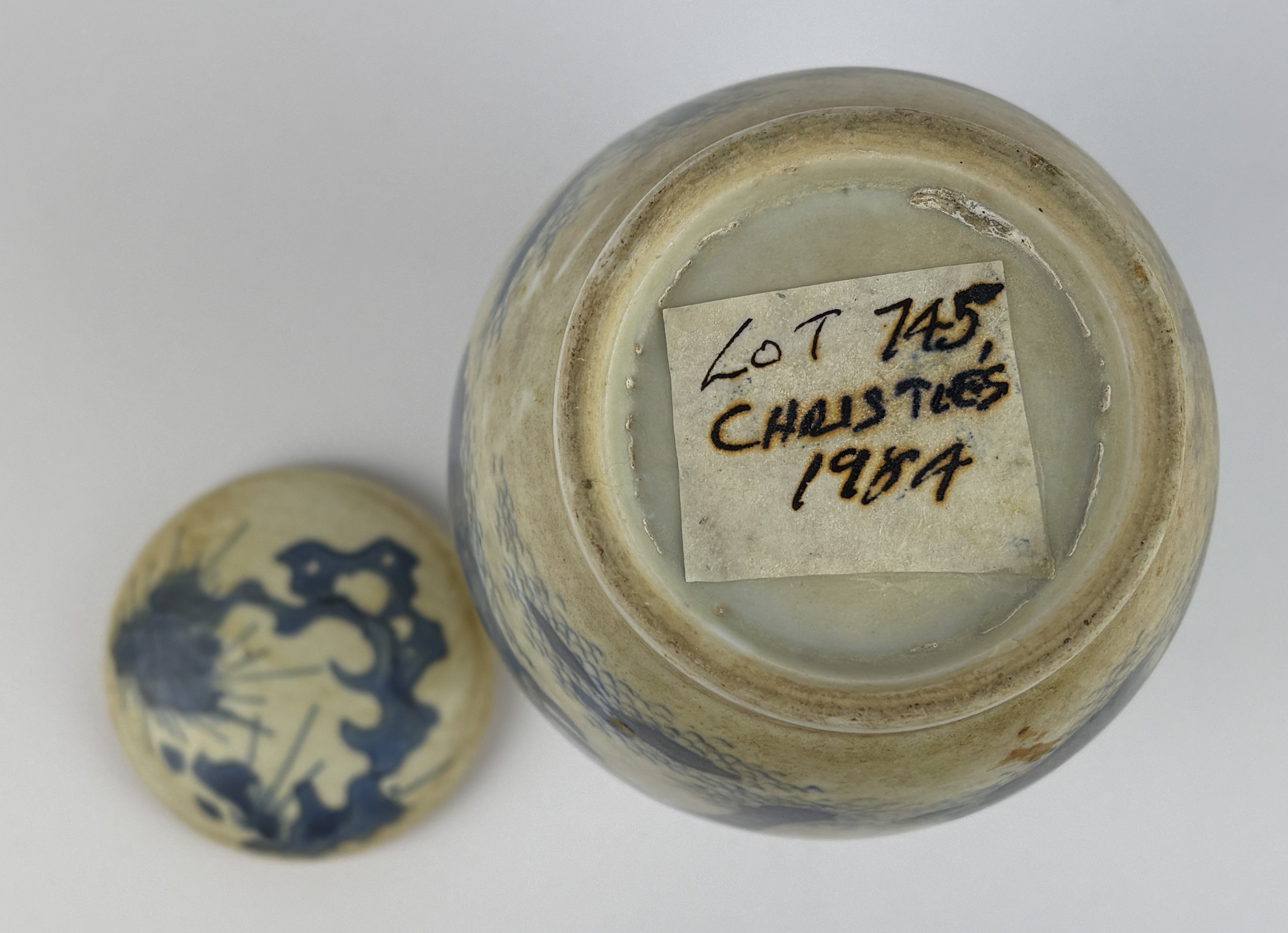 An antique Chinese blue and white porcelain covered jar, probably Transitional period c.1640, old handwritten label underside inscribed "Lot 745 Christies 1984", 21cm high.