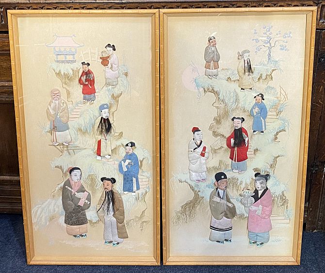 Provenance: the antique silkwork figures were brought back seperately from China in the 1920's by a family member and later inset to the mounts and frames.