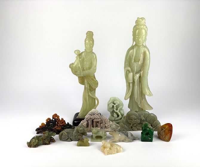 A collection of Chinese / Japanese carved hardstone and reconstituted stone models to include two green hardstone figures of Guanyin, tallest 35.5cm (14)