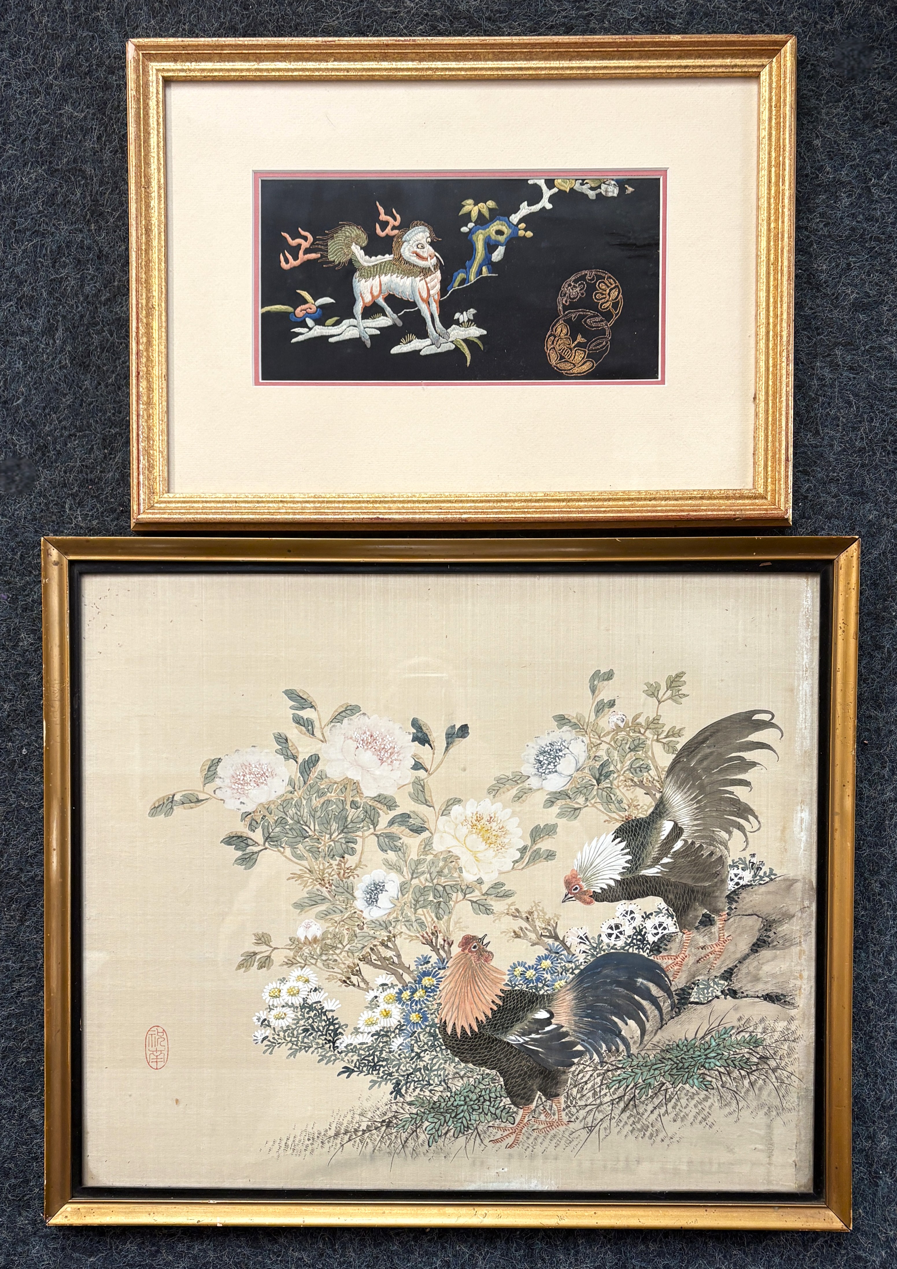 A framed Japanese painting on silk depicting hen and rooster amongst flowers, red seal mark, 35cm by 41cm, and a framed needlework depicting a lion 11cm by 22cm
