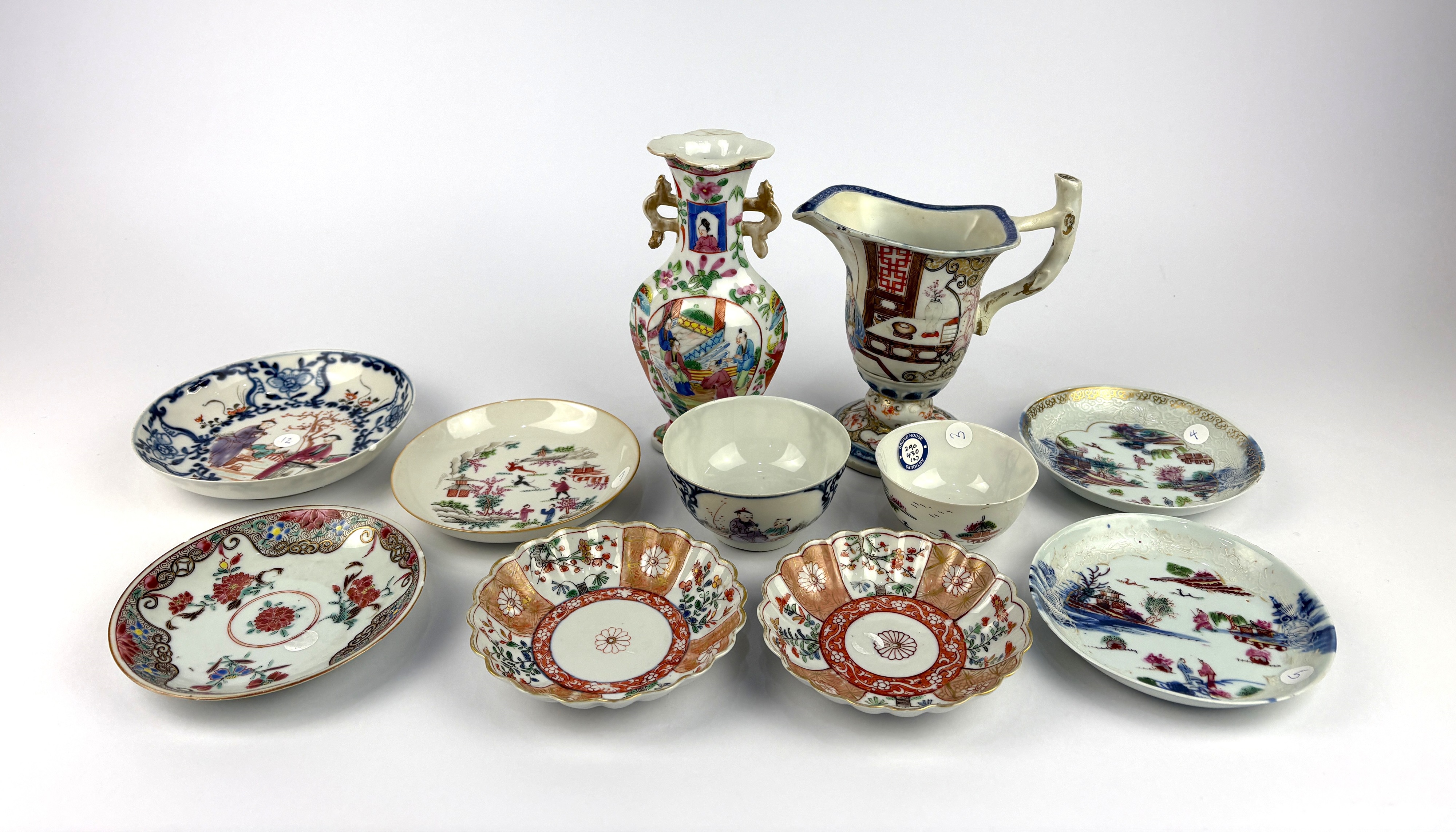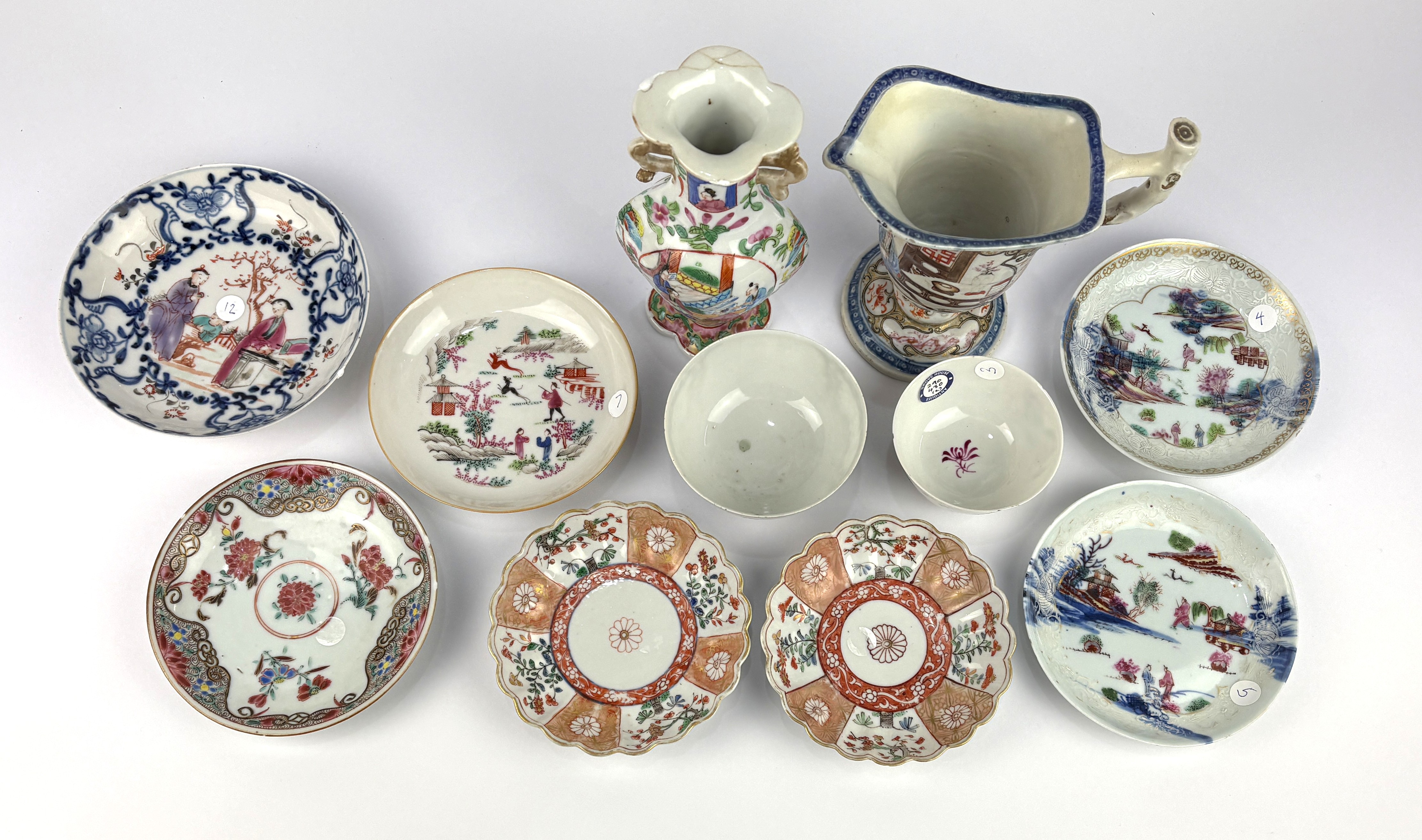 A collection of 18th / 19th century Chinese porcelain tea bowls and saucers to include a matched teabowl and saucer decorated with a stag hunt, paper labels for Jill Mcneile and Drove House Antiques, together witha small Chinese famille rose vase and a restored helmet shaped creamer (a/f)