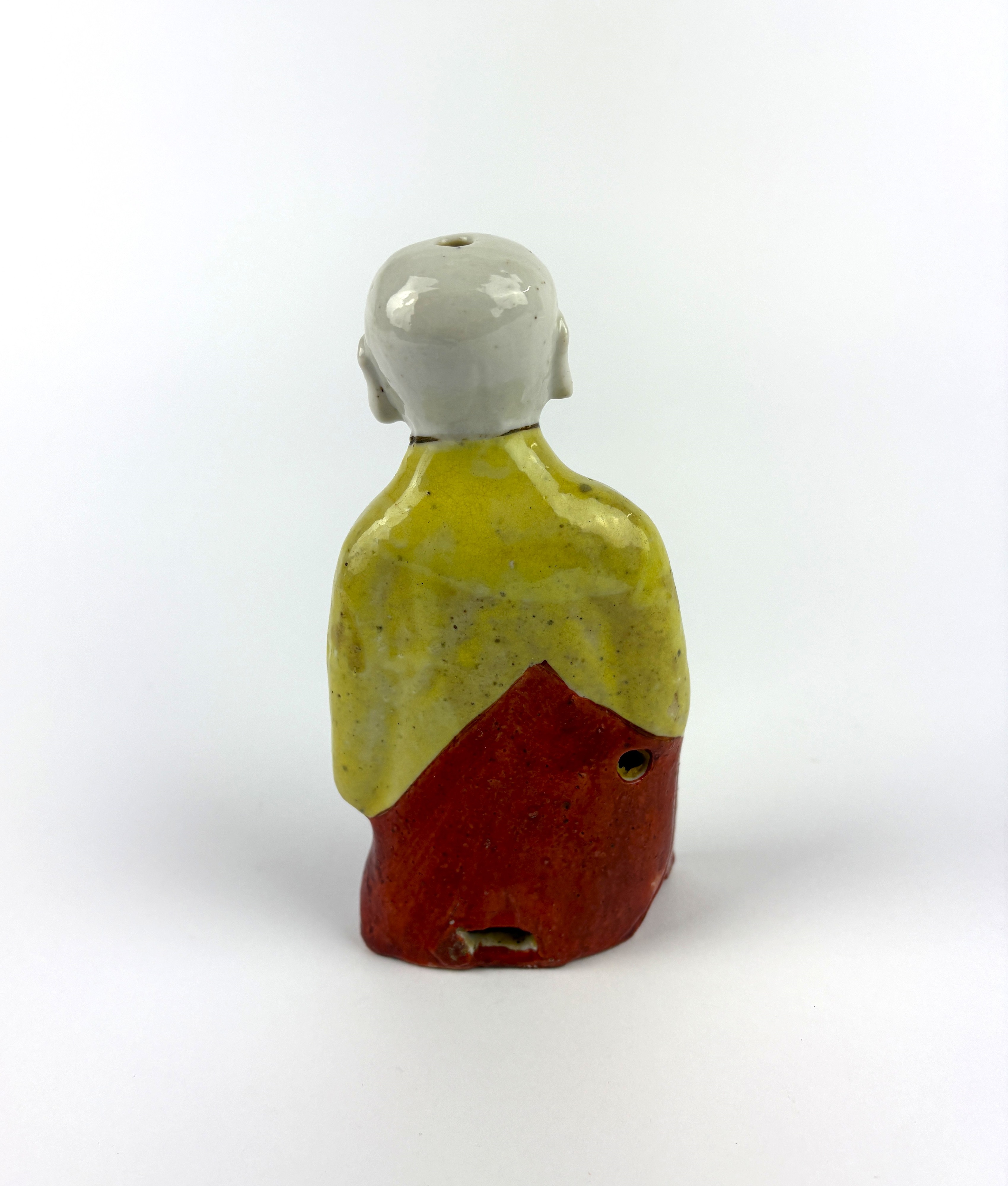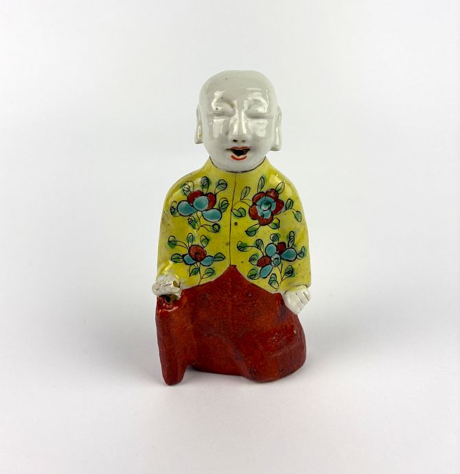 An antique Chinese porcelain laughing boy figure (also known as a Ho Ho boy), probably c.1820, painted with a famille jaune jacket over iron red garments, 14.5cm high.