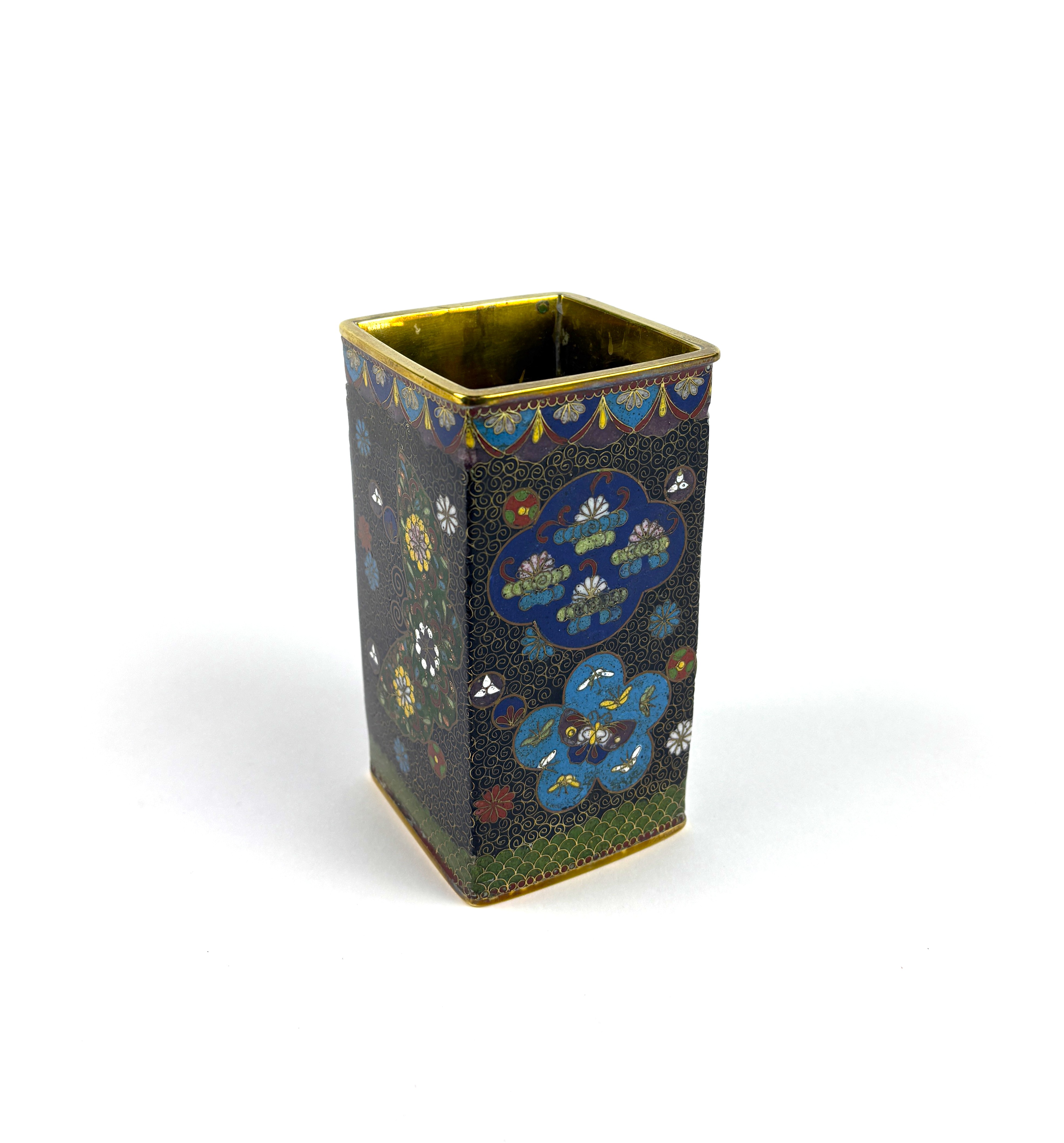 A Japanese Meiji period cloisonne enamel gilt-metal vase, of square form, decorated to all four outer surfaces, 12.5cm high.
