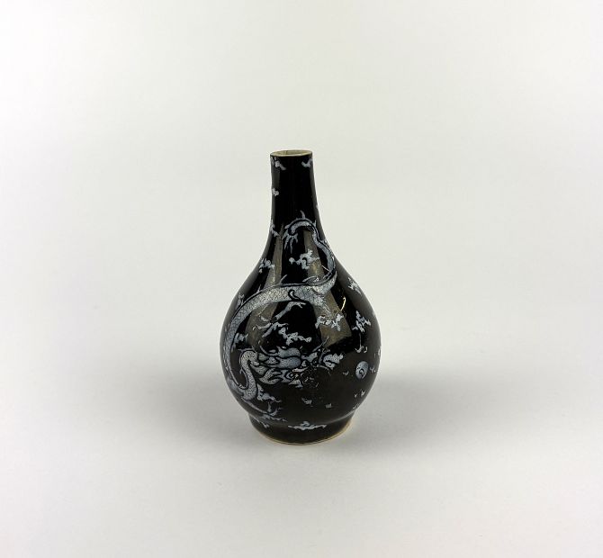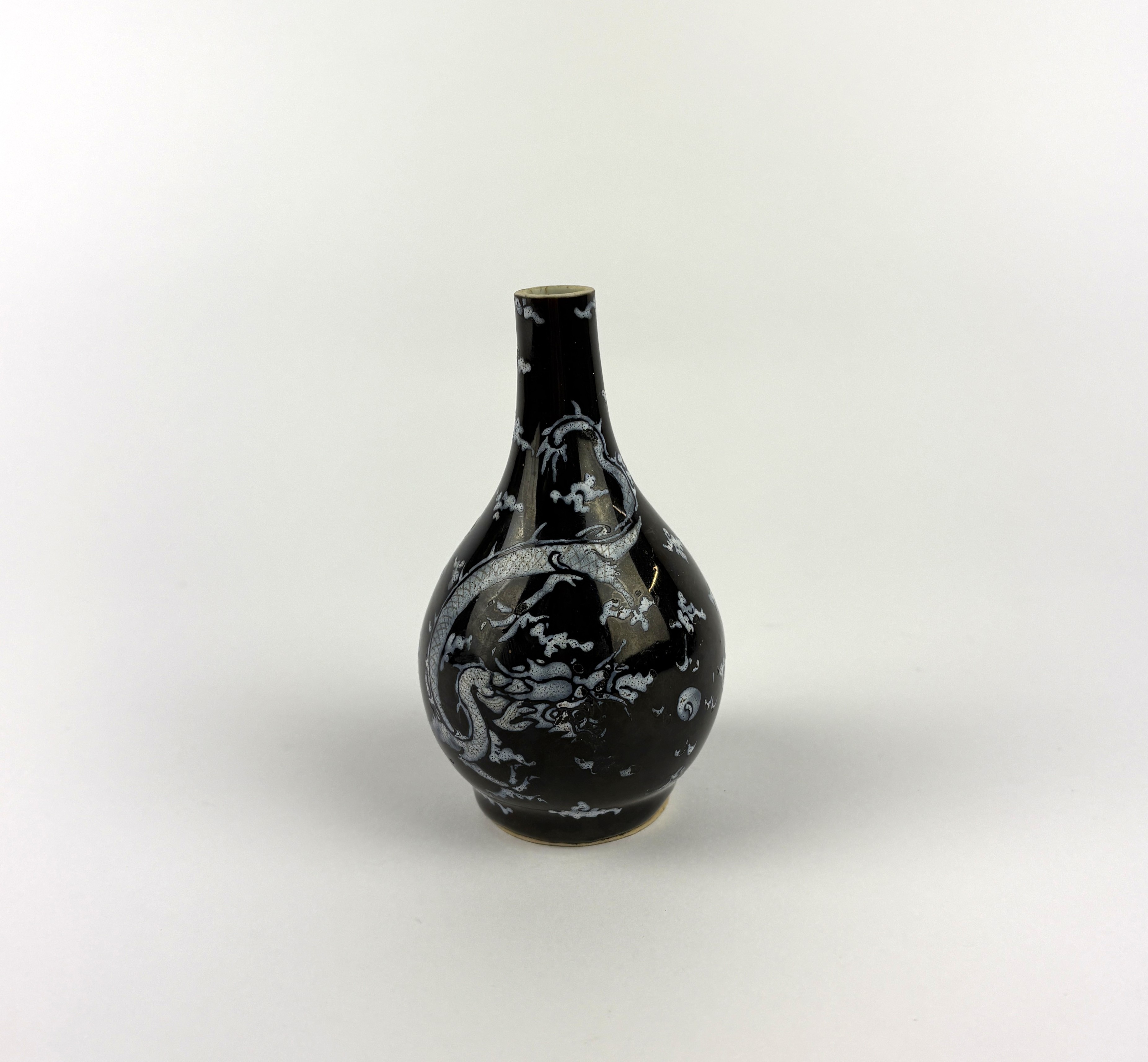 An antique Chinese porcelain miniature bottle vase, probably c.1720, with white enamel decoration on a dark ground glaze, old hand written label underside inscribed "Brocklebank collection, Kent", 10cm high, (af).