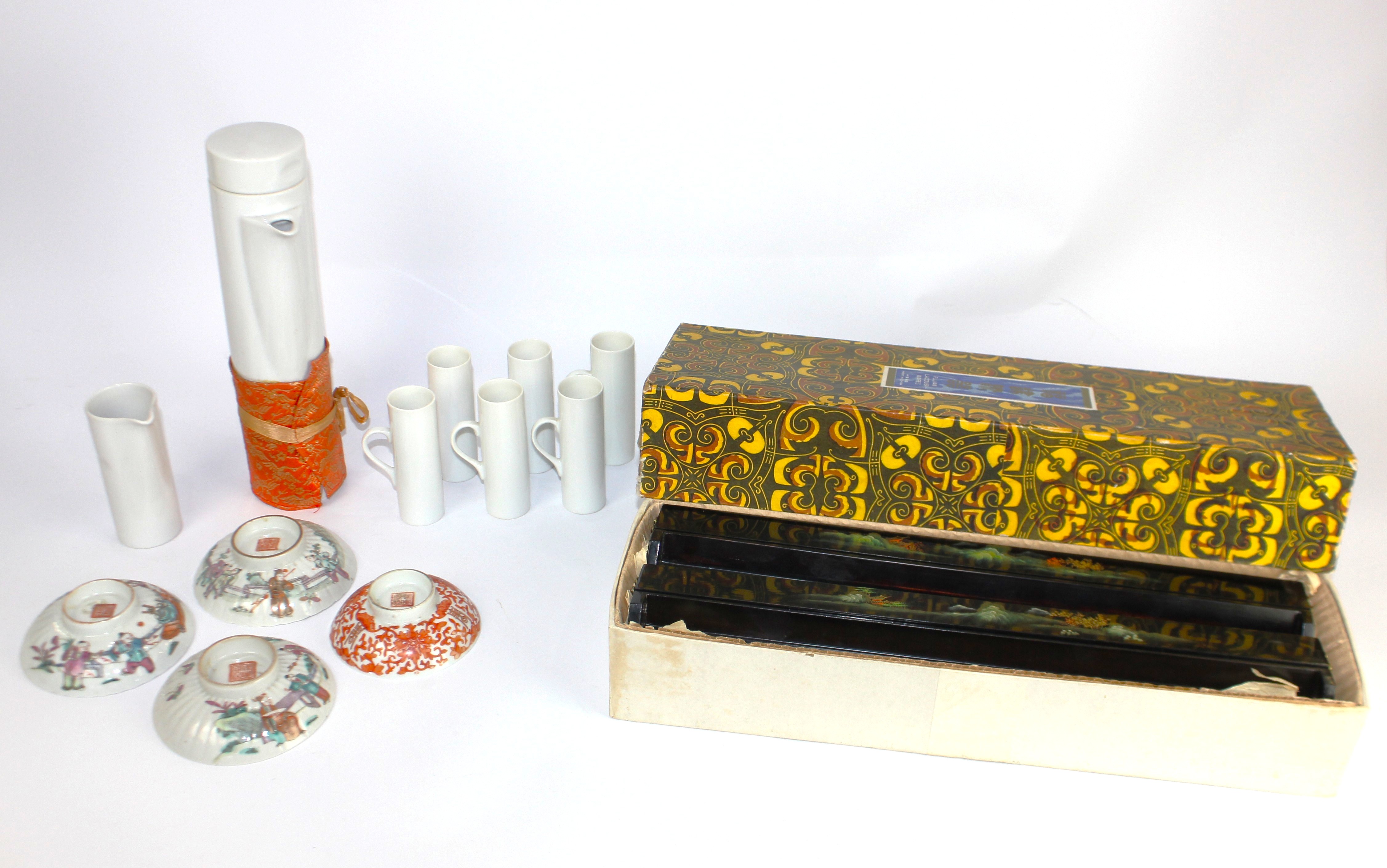 Three Chinese porcelain bowls with figural decoration, seal mark to base, 11cm diameter, and another similar, together with a Chinese 'Fujian Laquer-Wares' mahjong set, boxed, and a Schmid white porcelain coffee set comprising coffee pot, milk jug and six espresso cups