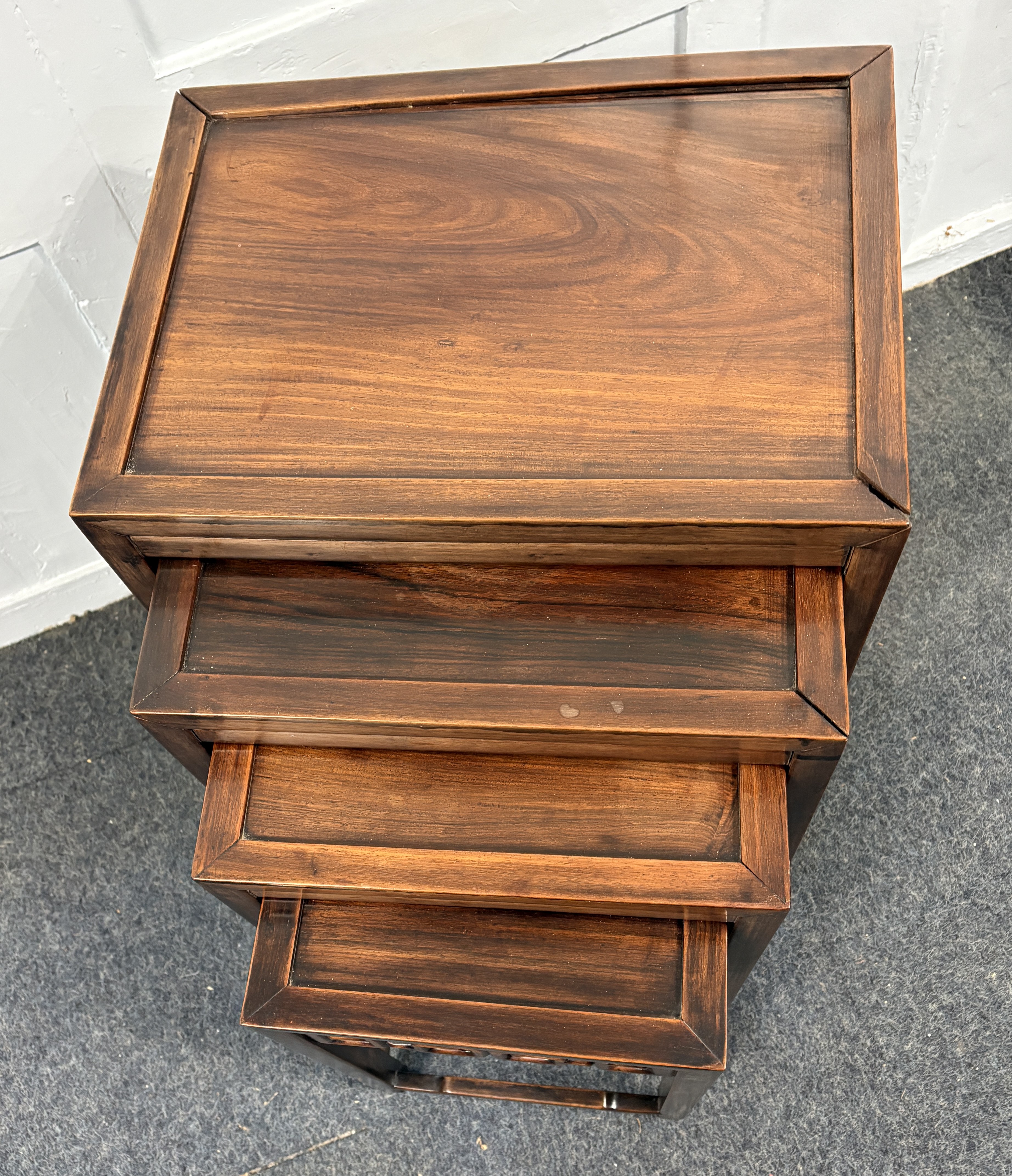 A Chinese export quartetto of four graduated side tables, 20th century, of rectuangular form with plain suppports and pieced frieze panels, largest 47cm by 34cm, by 68cm high.