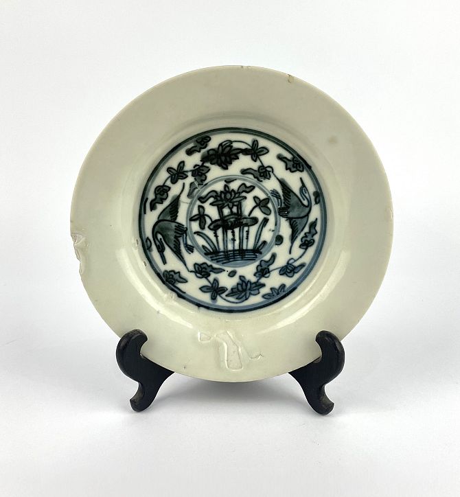A Chinese blue and white porcelain plate, decorated to centre with a pair of cranes in flight amongst floral sprays, diameter 19cm (AF)