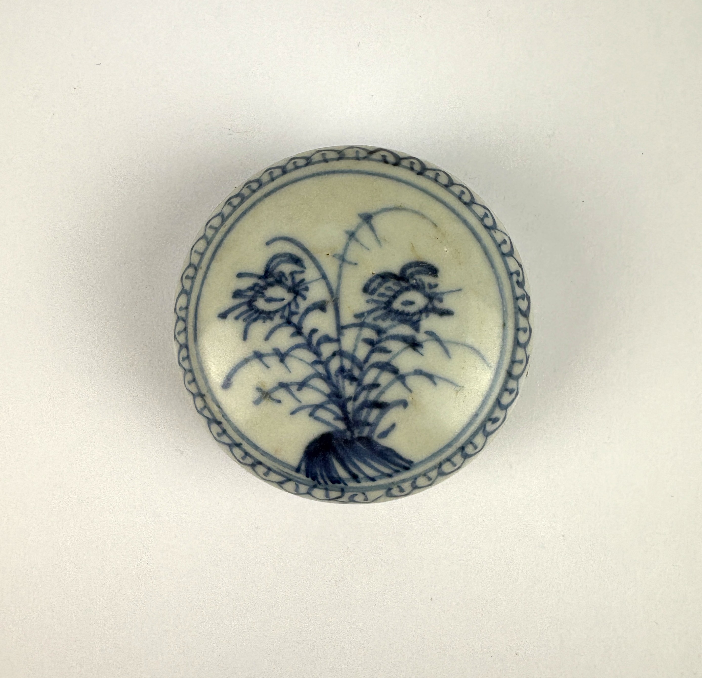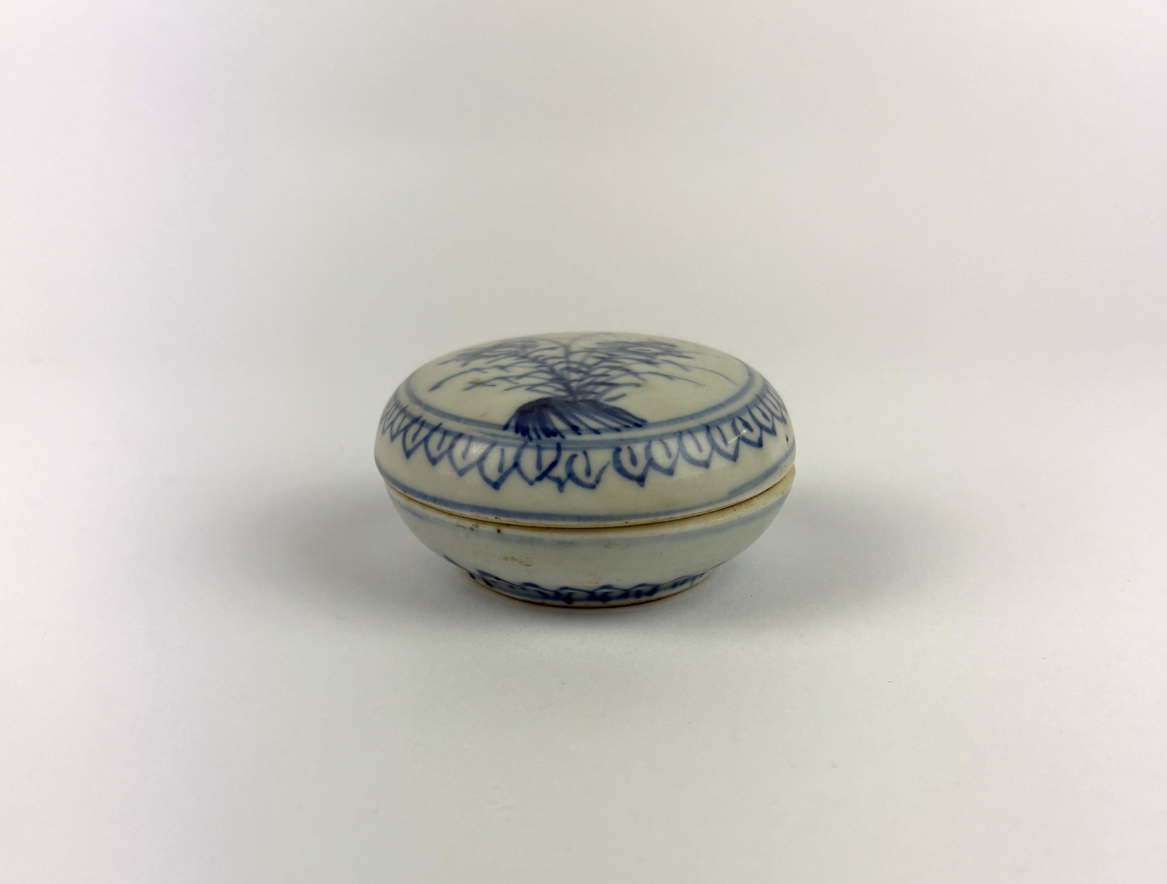 An antique Chinese blue and white porcelain covered box, probably c.1723-35 Ca Mau Shipwreck, with certificate of Authenticity, foliate painted decoration, 7cm diameter by 4cm high.