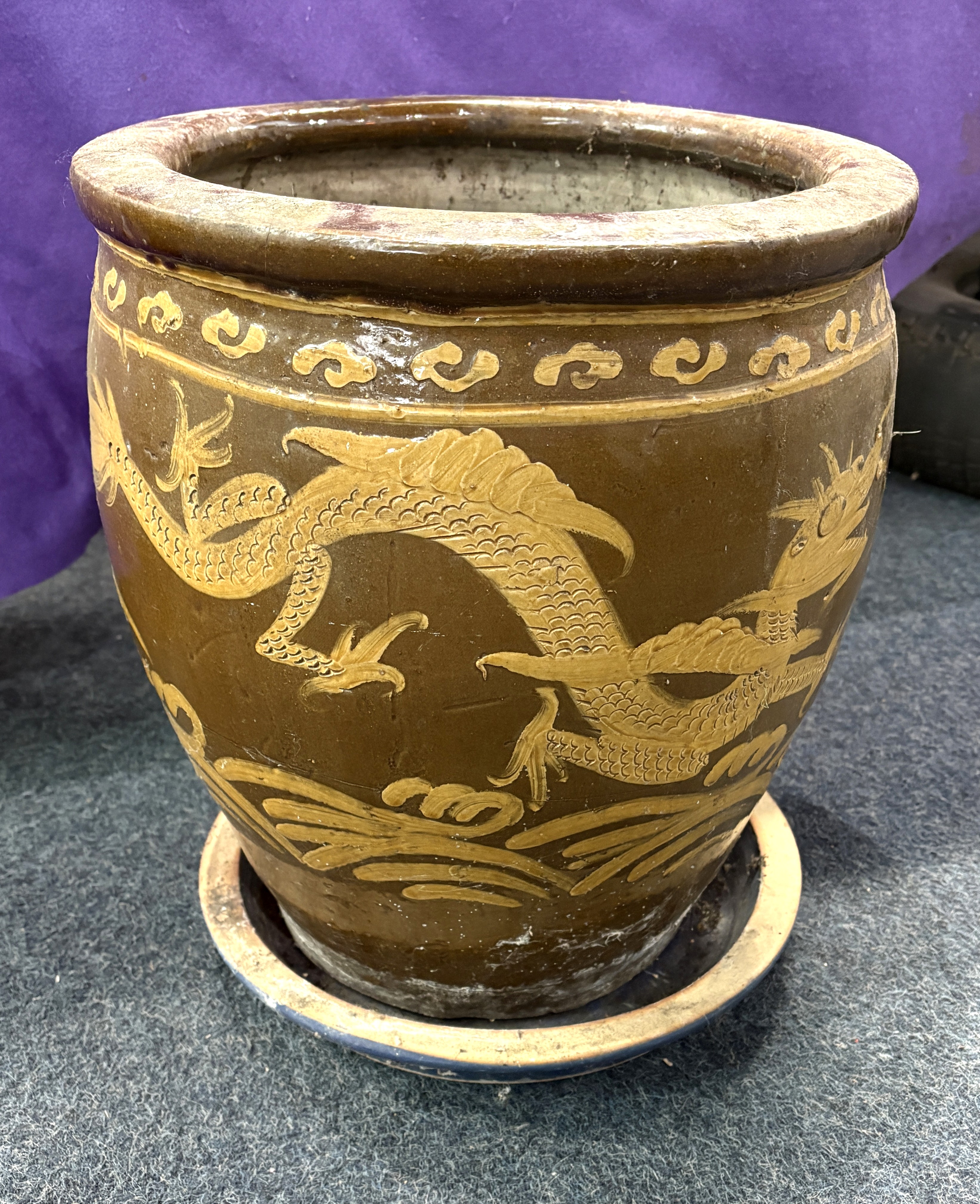 A Chinese egg pot planter with yellow dragon motif on brown ground, 36cm high, 35cm wide