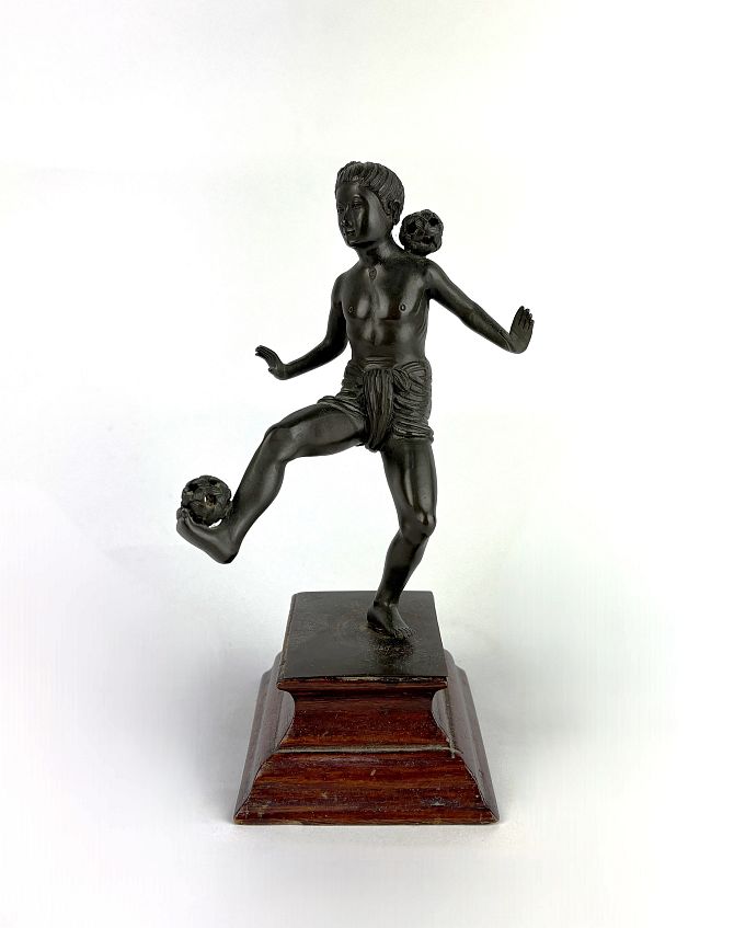 A bronze model of a youth playing Chin-lon, mounted on a wooden plinth base, insribed paper label verso, 19cm high including base