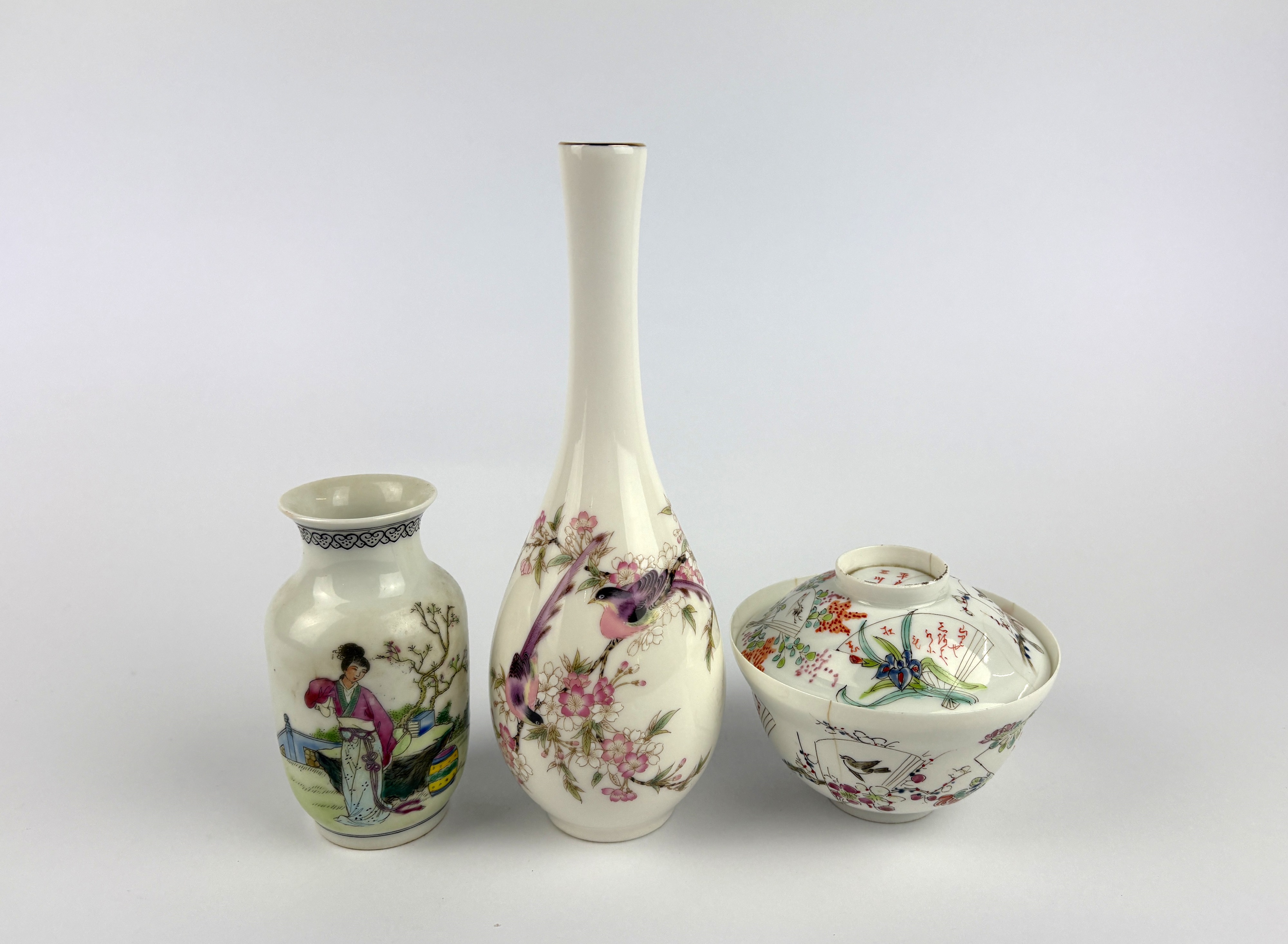 An antique Chinese porcelain covered bowl, the delicate 'eggshell' type body painted in famille rose enamels with birds, foliage, fans, and script, six character mark to both elements, 9.5cm diameter by 7.5cm high, (af). A Chinese famille rose porcelain miniature vase, painted with a female figure in a garden setting, and with script, underside with iron red seal mark, 10cm high. Together with a Japanese Yamaji famille rose porcelain bottle vase delicately painted with birds in blossoming branches, 19cm high, (3).
