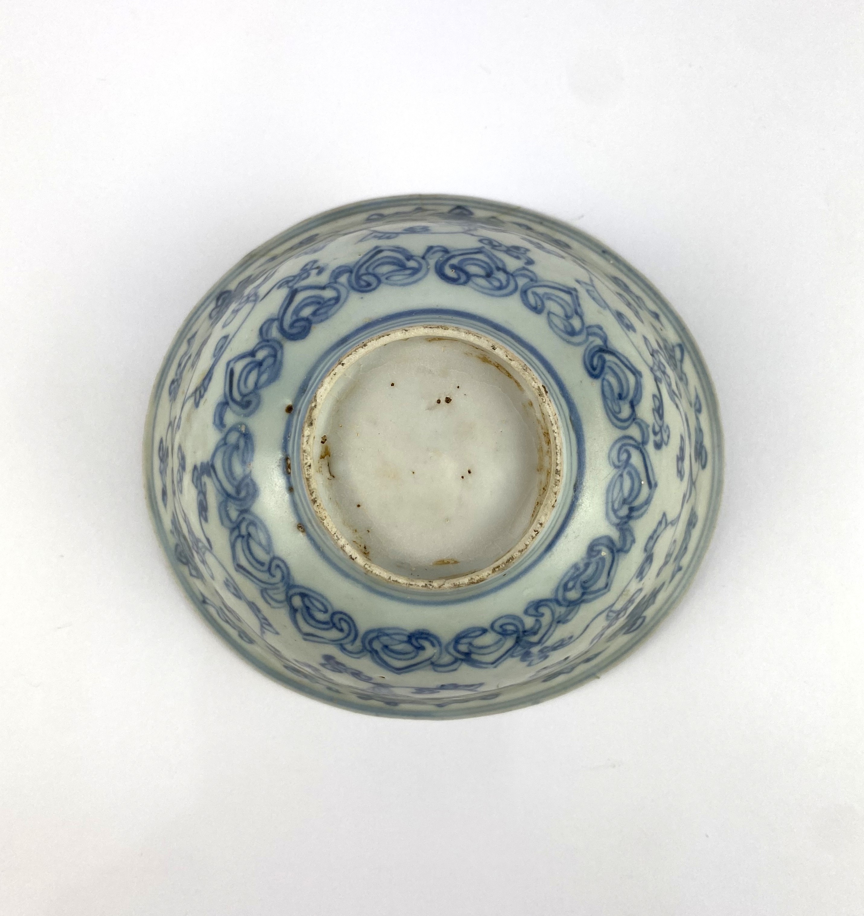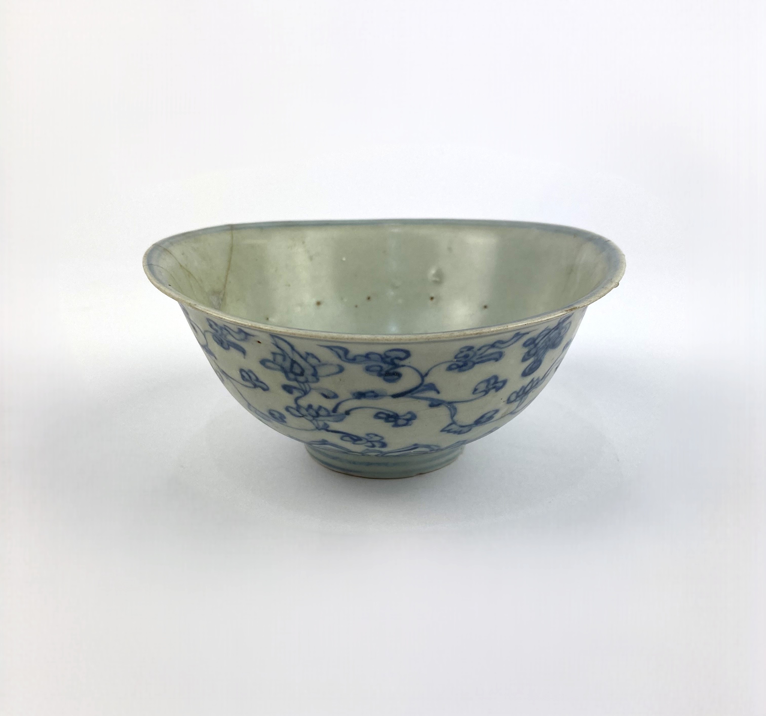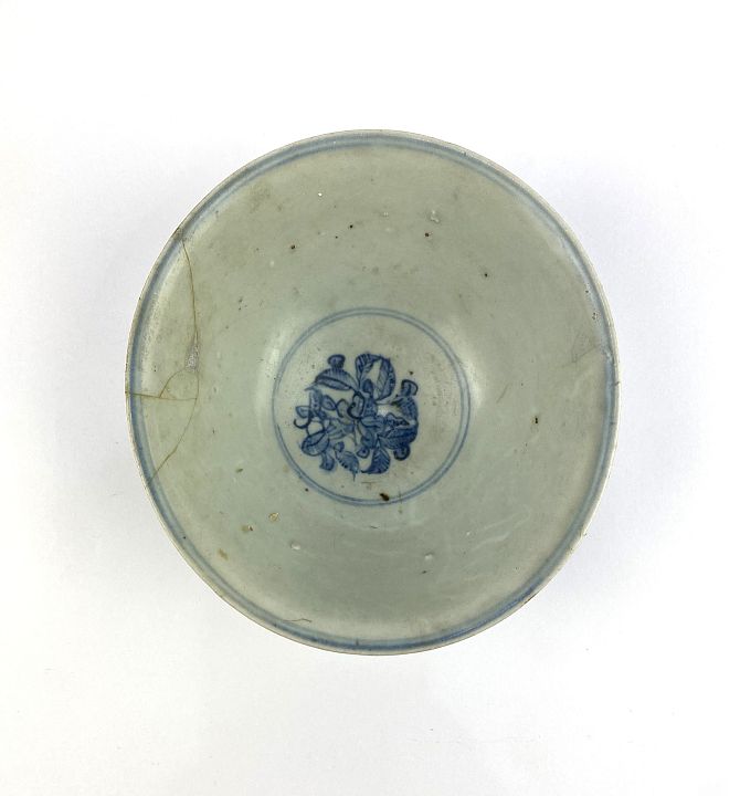 A Chinese blue and white decorated bowl, 18th century, of oval form, exterior decorated with floral motif, interior central decorated with flowers, width 15cm (AF)