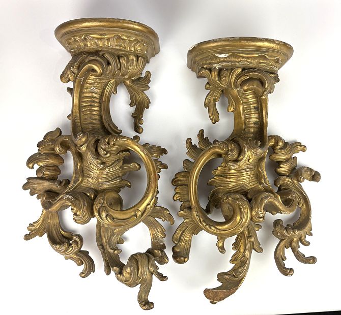 A pair of French giltwood wall brackets with curved shelf above a pierced foliate scroll backplate, shelf 17cm deep, 20cm wide, wall bracket 52cm high