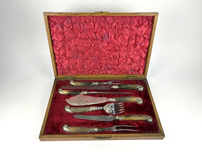 A 19th century Aesthetic Period silver plated and horn handled carving set, c.1870 / 1880, the seven piece set contained in a lined and fitted inlaid light oak case, case 46cm wide.