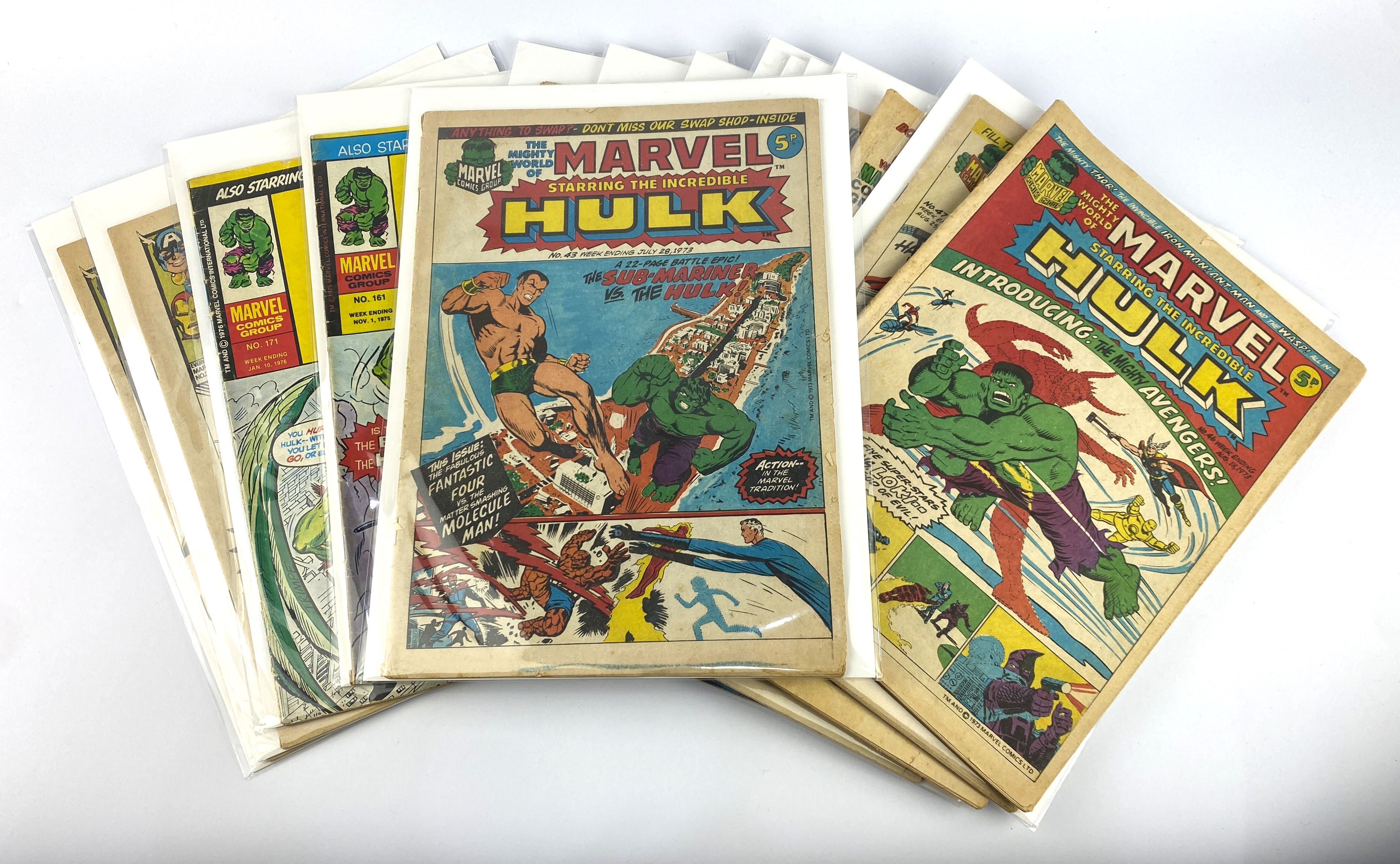 Comics: A collection eighteen British Marvel comic books, sixteen Mighty World of Marvel Starring The Incredible Hulk comic books, Bronze Age, 1973 - 1976, including; #43, #46, #47, #50, #58, #59, #61, #65, #66, #73, #114, #177, #119, #142, #161, #171, together with two British Captain America comic books, No. 3 and No. 4, some bagged and carded (18)