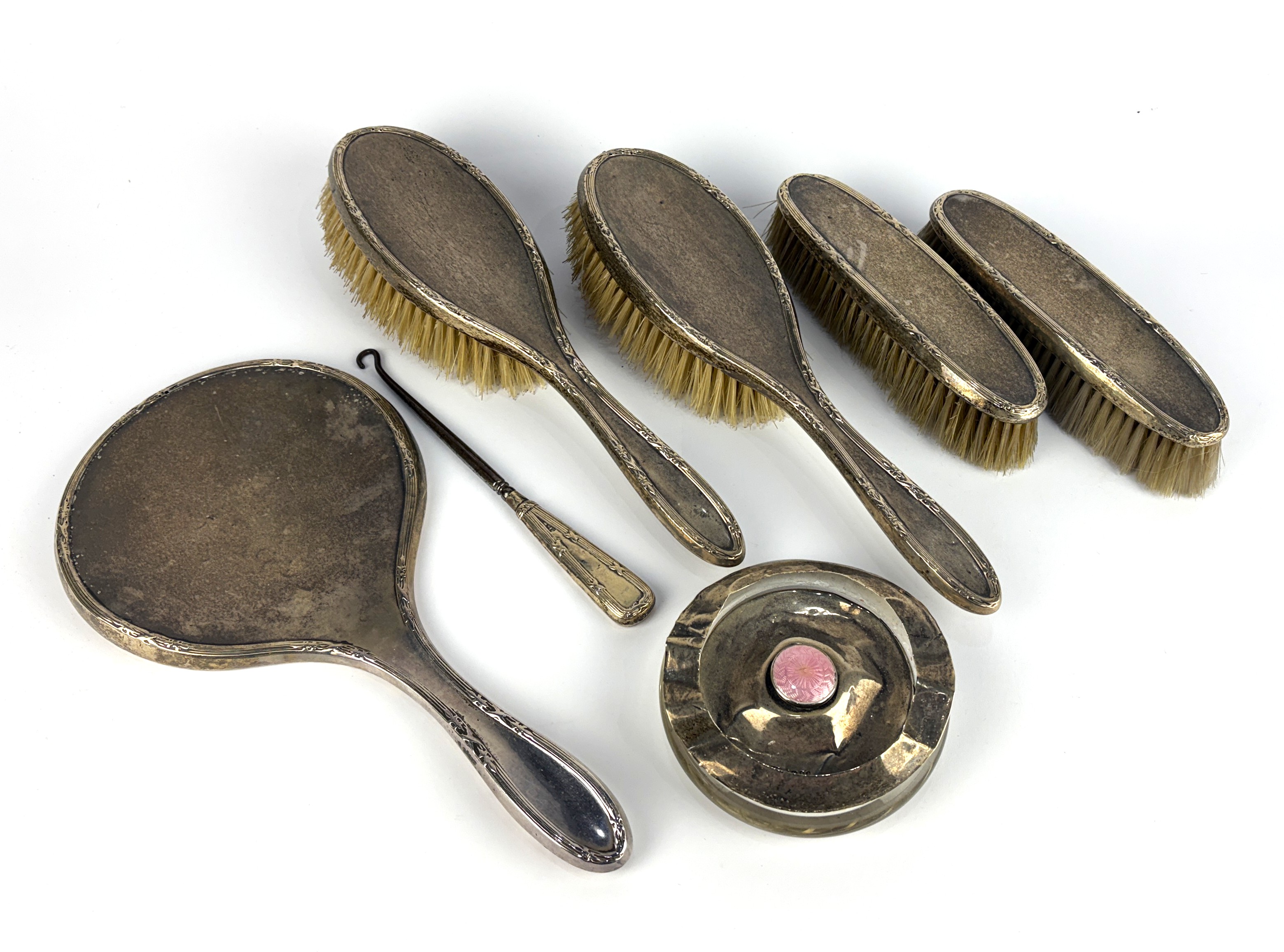 A George V five-piece silver backed dressing table set, makers marks worn, Birmingham, 1916, comprising; hand mirror and four brushes, with a silver handled button hook of similar design and a silver topped dressing table jar, the hand mirror height 27.5cm (all AF) (7)