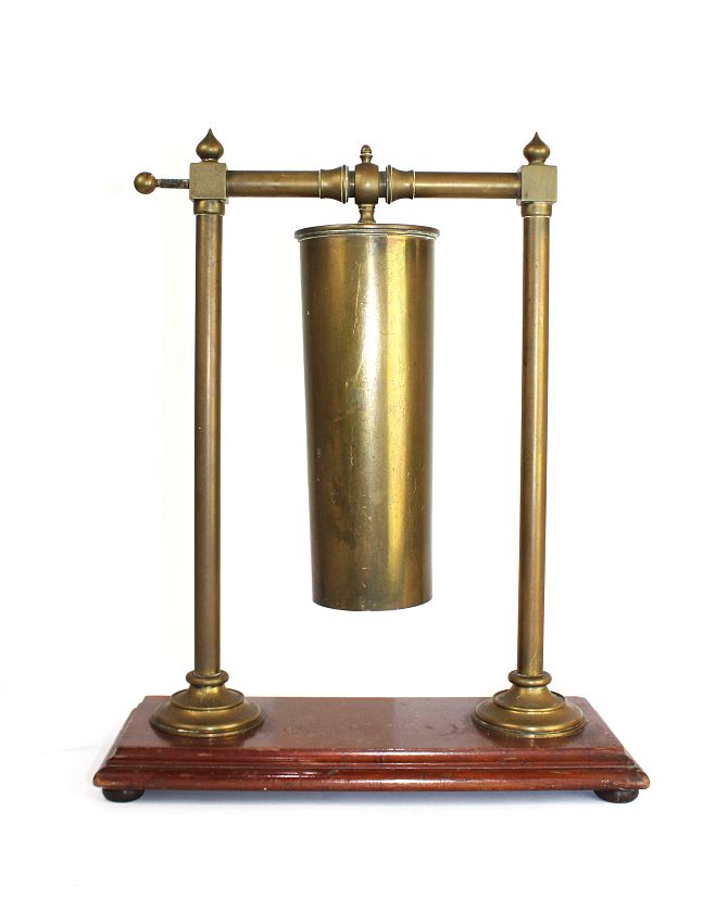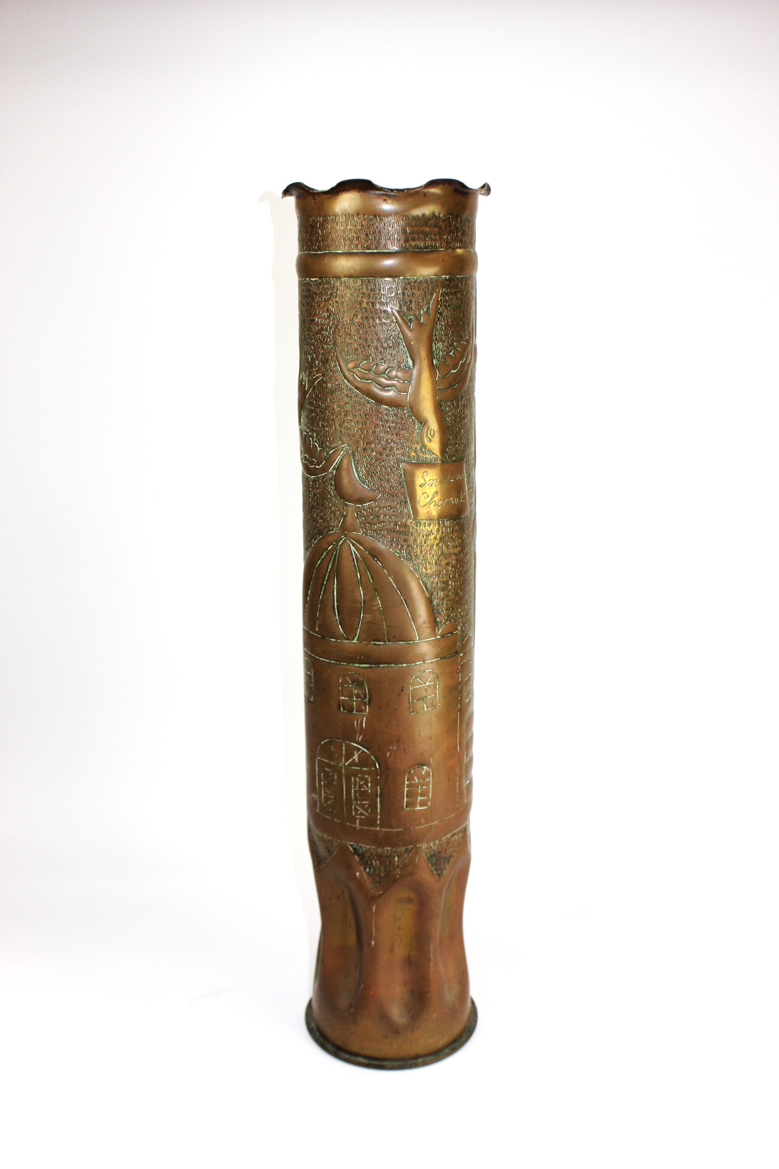 Two First World War brass trench art artillery shells, one fashioned as a tall stick stand with repousse, hammered and engraved decoration of a building and birds 'Souvenir Chanak', 81cm high, the other mounted as a dinner gong (PLEASE SEE TWO PUBLISHED IMAGES IN ONLINE CATALOGUE)