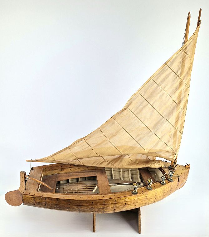A vintage clinker built model of a pond yacht, with sail on stand, height overall 58cm, together with four miniature painted Chinese figures (5 items)