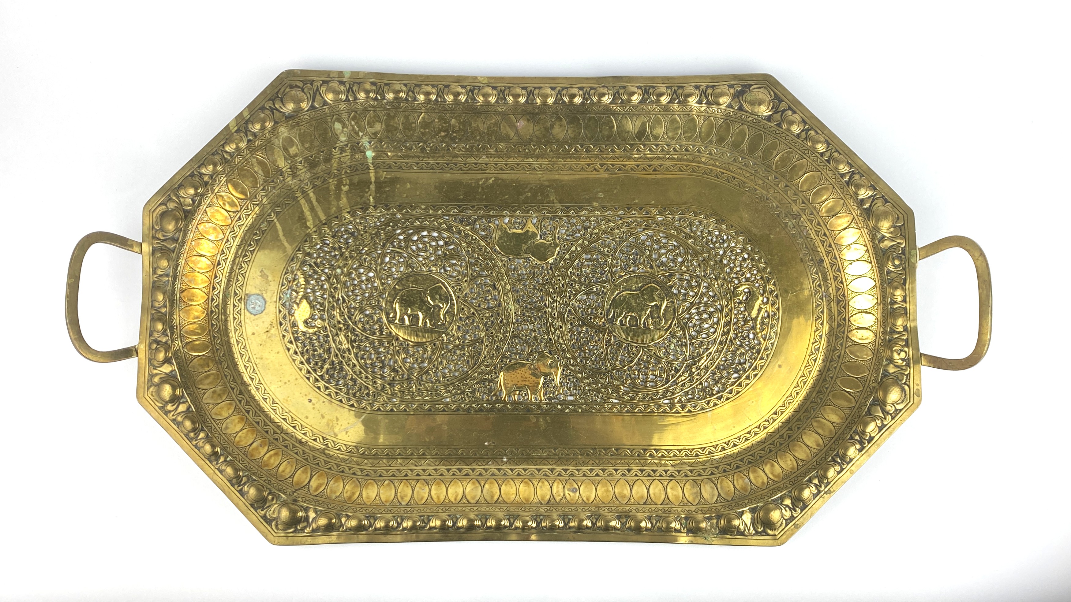 A brass two-handled tray, possibly Sri Lankan, with with pierced decoration of elephants, 55cm handle to handle