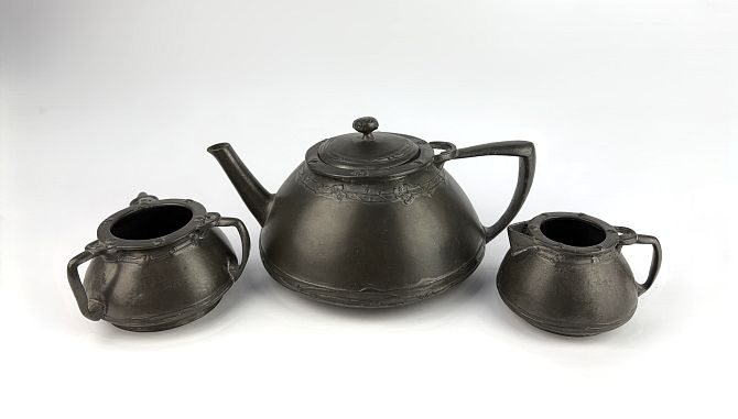A Jesse Marion King (1874-1949) for Liberty & Co 'Tudric' pewter three piece tea set comprising a teapot and cover, 11.5cm high, a sugar bowl, 6cm high; and a milk jug, 5.5cm high, all with stamped marks 'TUDRIC 0142' (3)