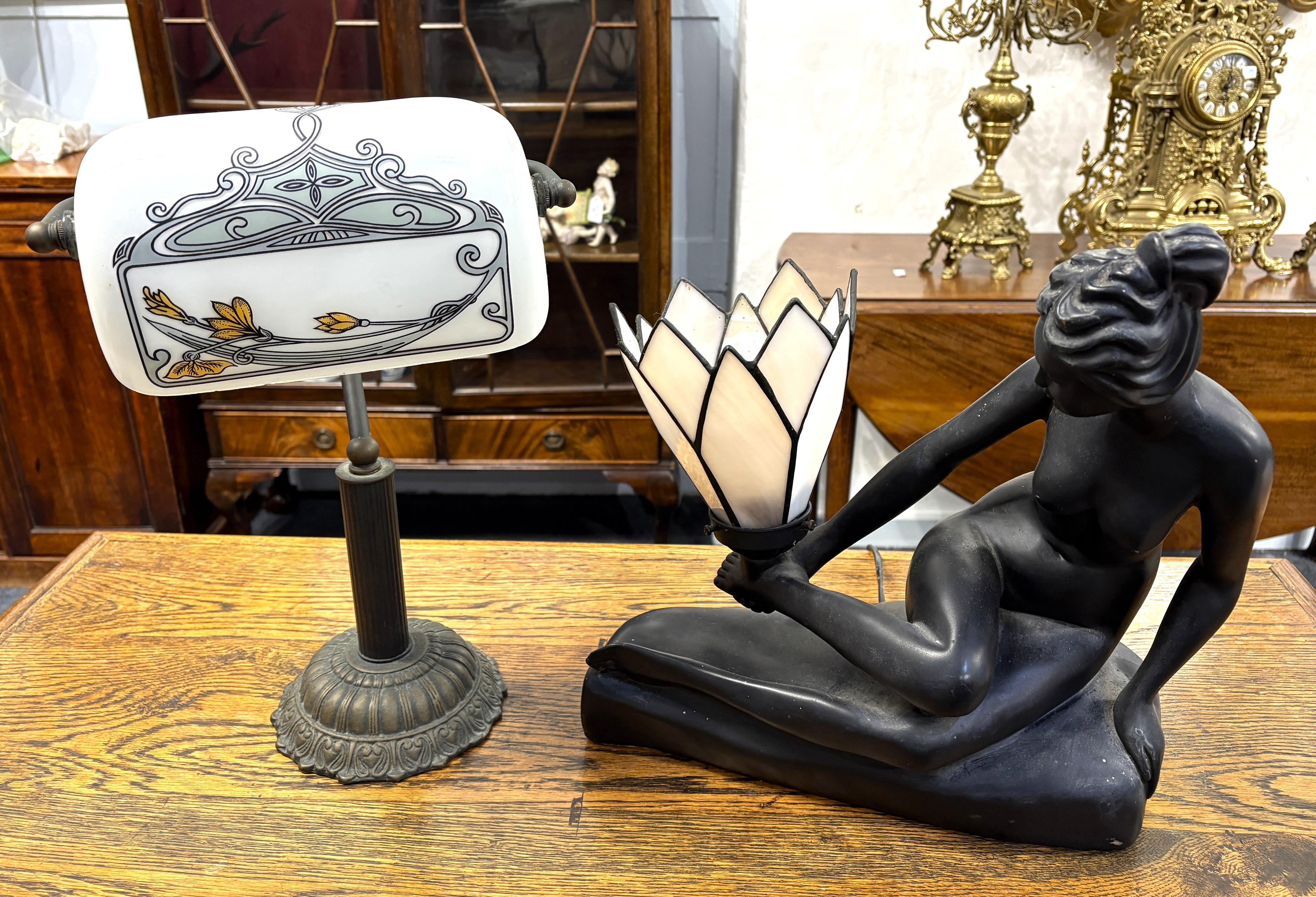 An Art Deco style composite table lamp in the form of a reclining nude figure with a pink flower glass shade, 36cm high, and a desk lamp with adjustable white glass shade on metal support (2)