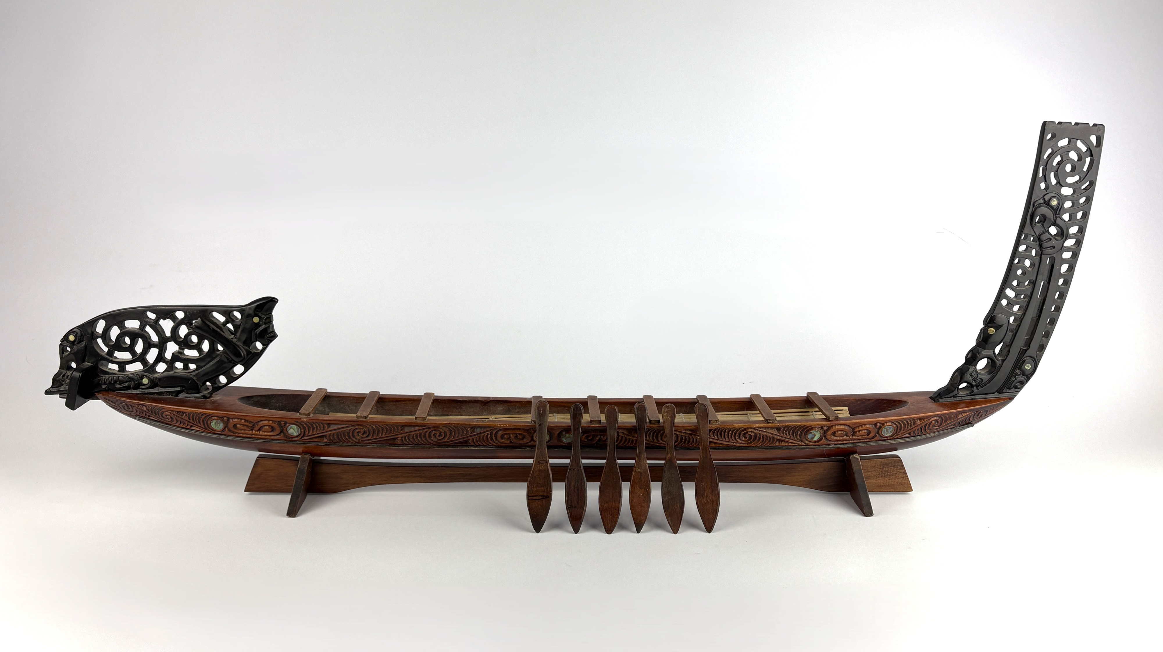 A vintage wooden model of a war Maori canoe, with pierced decorative hardwood detail, with six oars, on stand, length 76cm