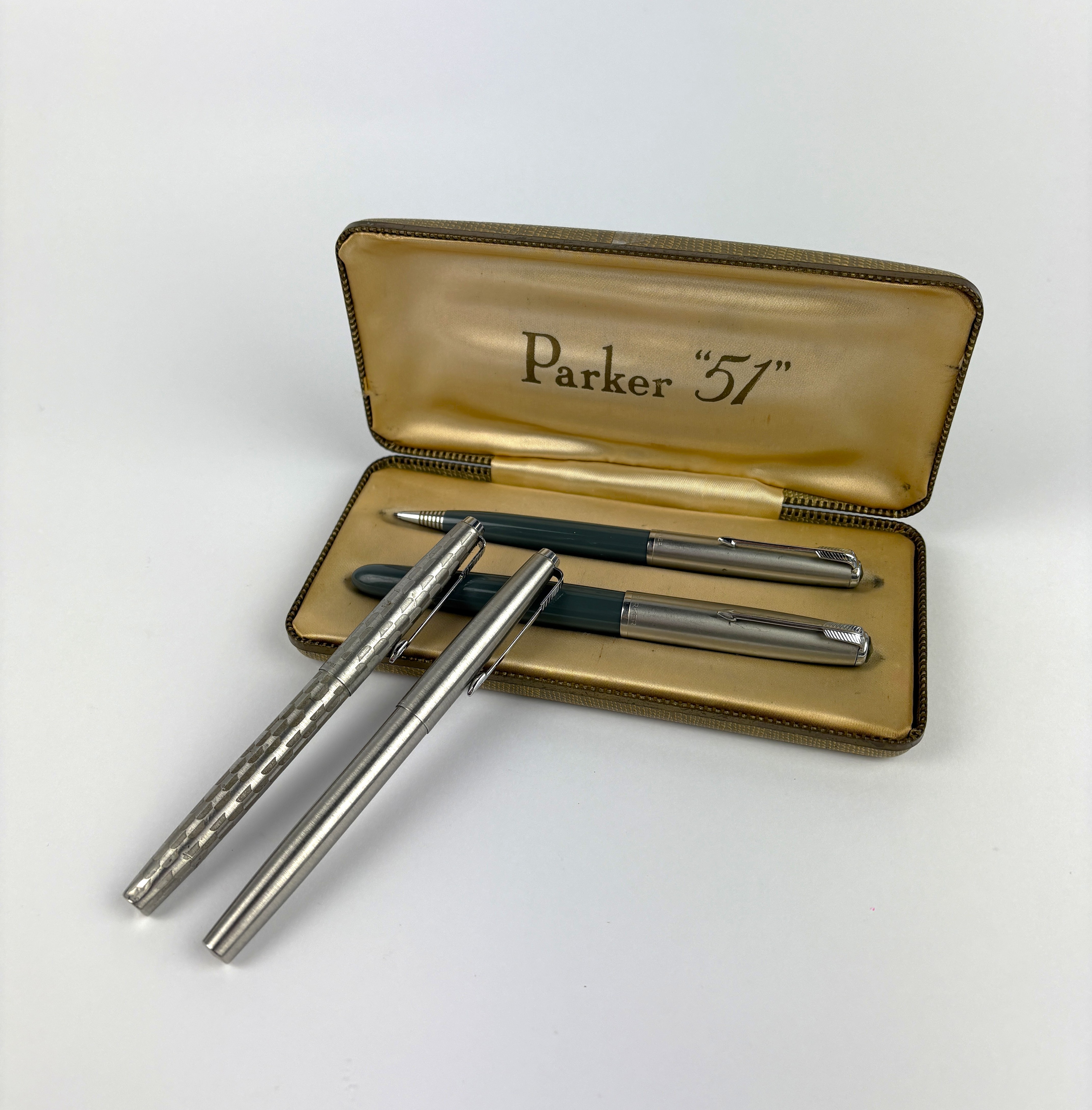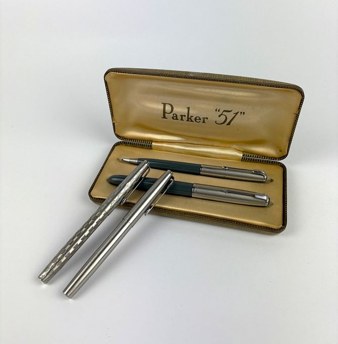 A Parker '51' cased pen set comprising propelling pencil and fountain pen, together with two Parker ballpoint pens
