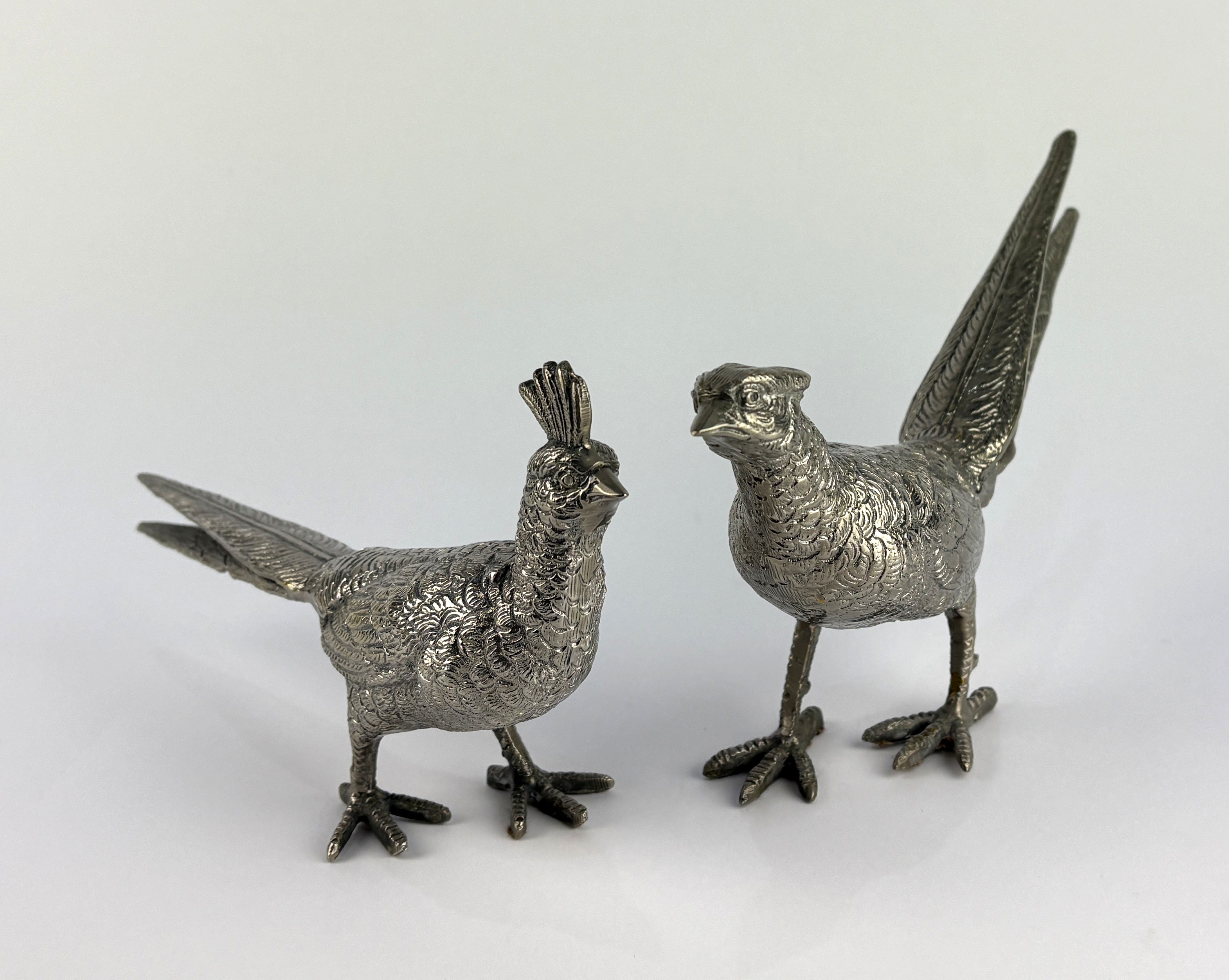 A pair of white metal models of pheasants largest 12.5cm high, 24cm long