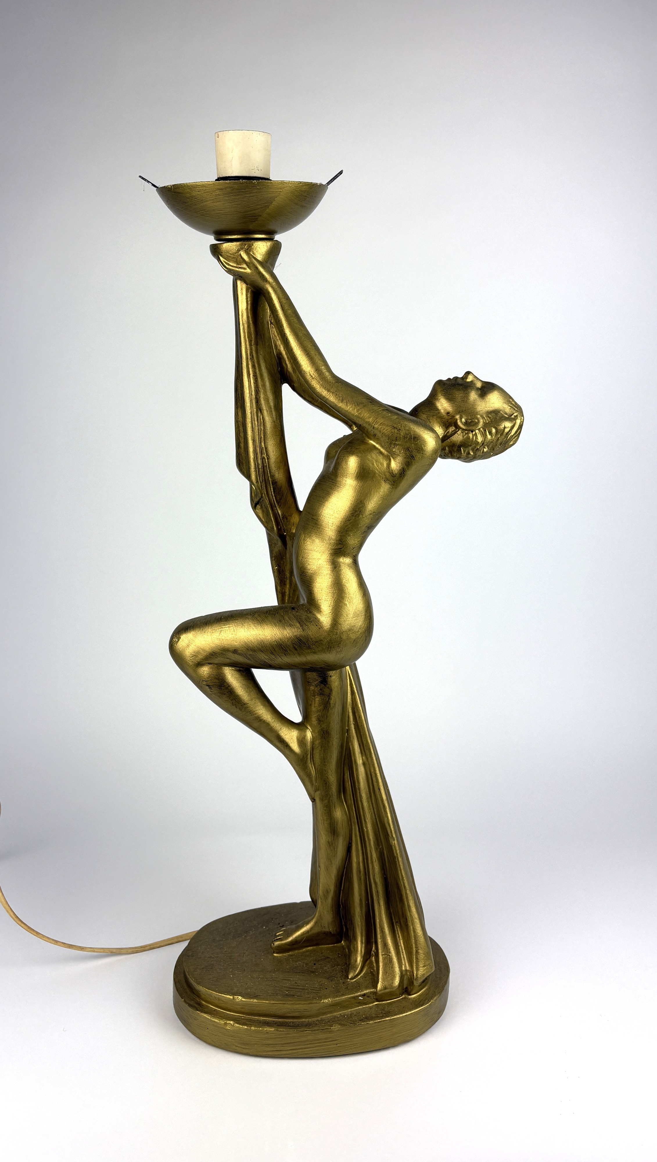 An Art Deco style gold painted figural table lamp in the form of a female nude holding the light aloft 61cm high