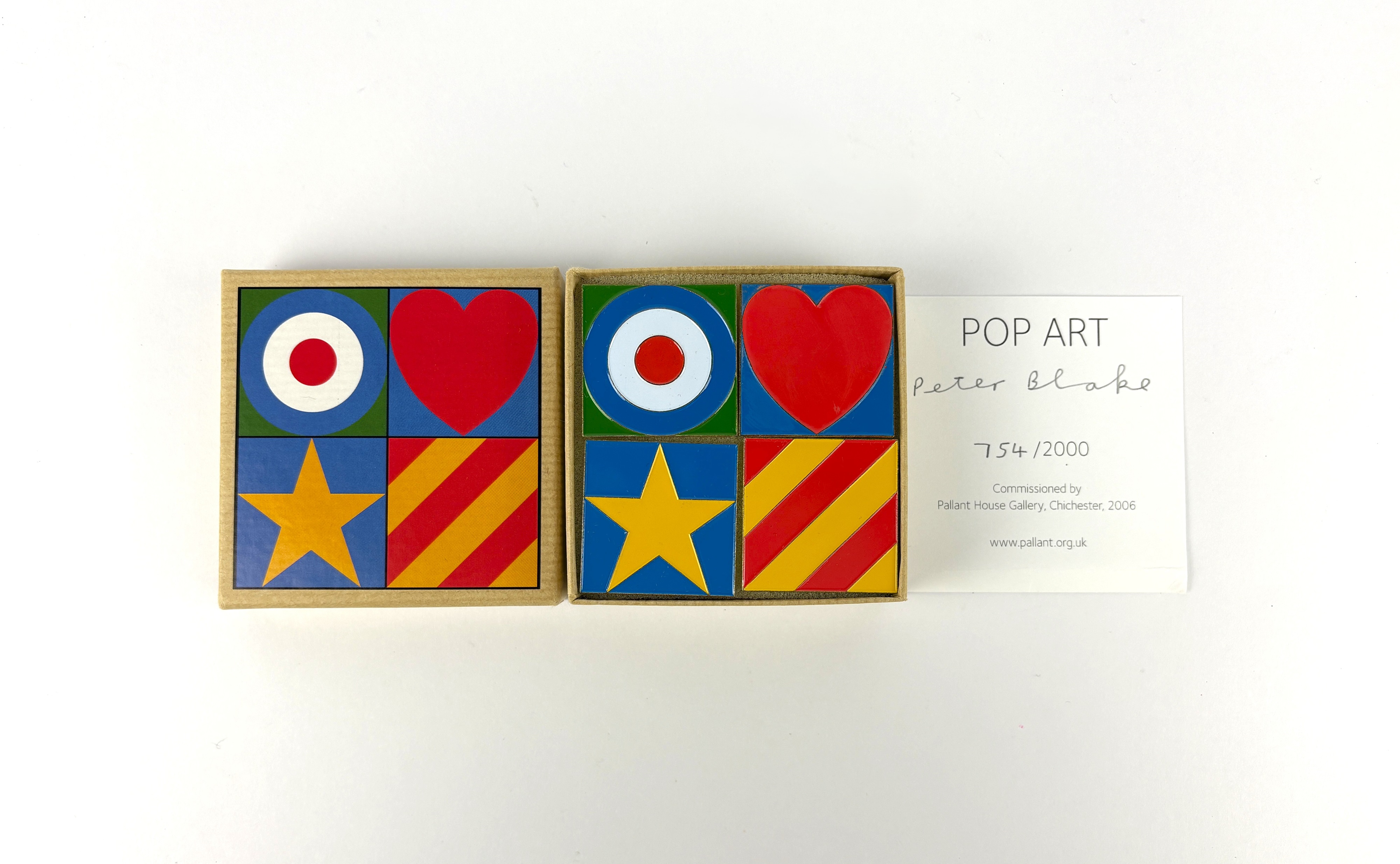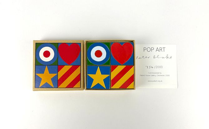 Peter Blake (b 1932), 'Pop Art', a set of four square enamel studs, limited edition No.754/2000, commissioned by Pallant House Gallery, Chichester, 2006, 3.5 by 3.5cm each, in a cardboard presentation box with certificate (ARR)