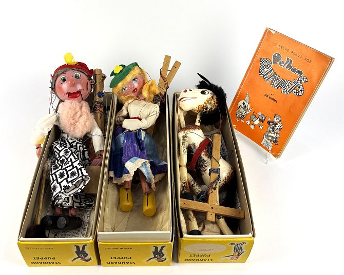 Three boxed Pelham Standard Puppets comprising Horse, Old Lady and Mother, together with a book 'Twelve Plays For Pelham Puppets' by Jan Bussell