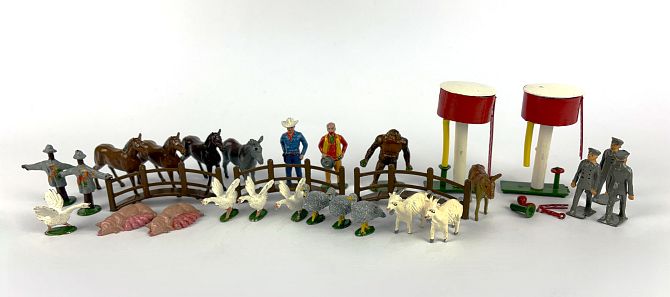 A collection of painted lead and some metal toy animals, figures, mostly farmyard themed, and related accessories