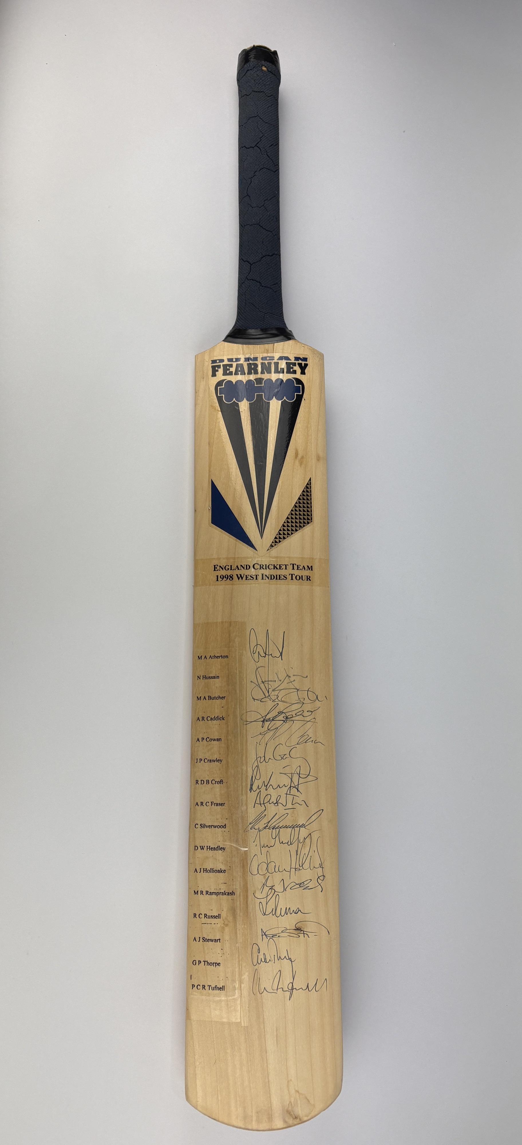 A cricket bat signed by the England Cricket Team 1998 West Indies Tour sixteen signatures to include M A Atherton, M R Ramprakash and P C R Tufnell