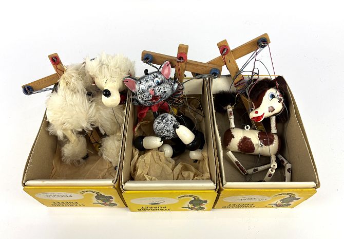 Three boxed Pelham puppets comprising foal, cat and white poodle