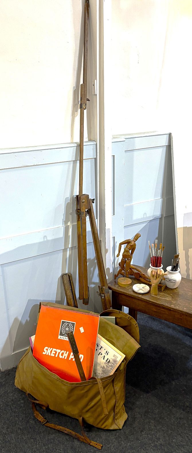 An artist's easel together with a collection of art materials and accessories, unused sketchpads etc