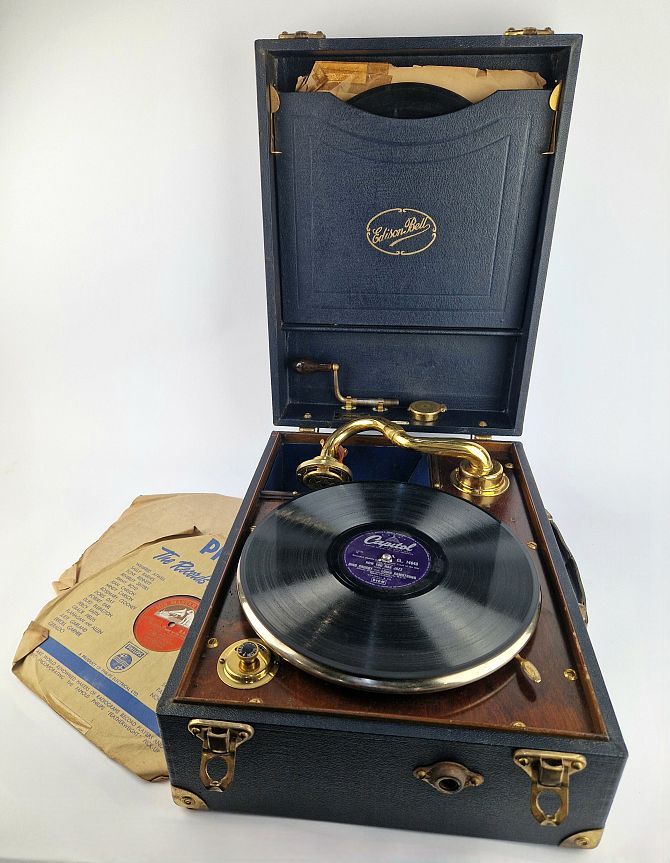 An Edison Bell portable gramophone with retail label from Harrods, together with a selection of vintage records