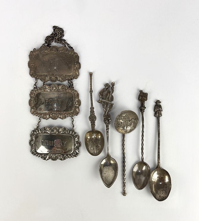 Three Elizabeth II silver decanter labels for Whisky, Sherry and Port, on metal chains, together with four silver souvenir spoons, combined gross weight 2.8oz, and a white metal spoon