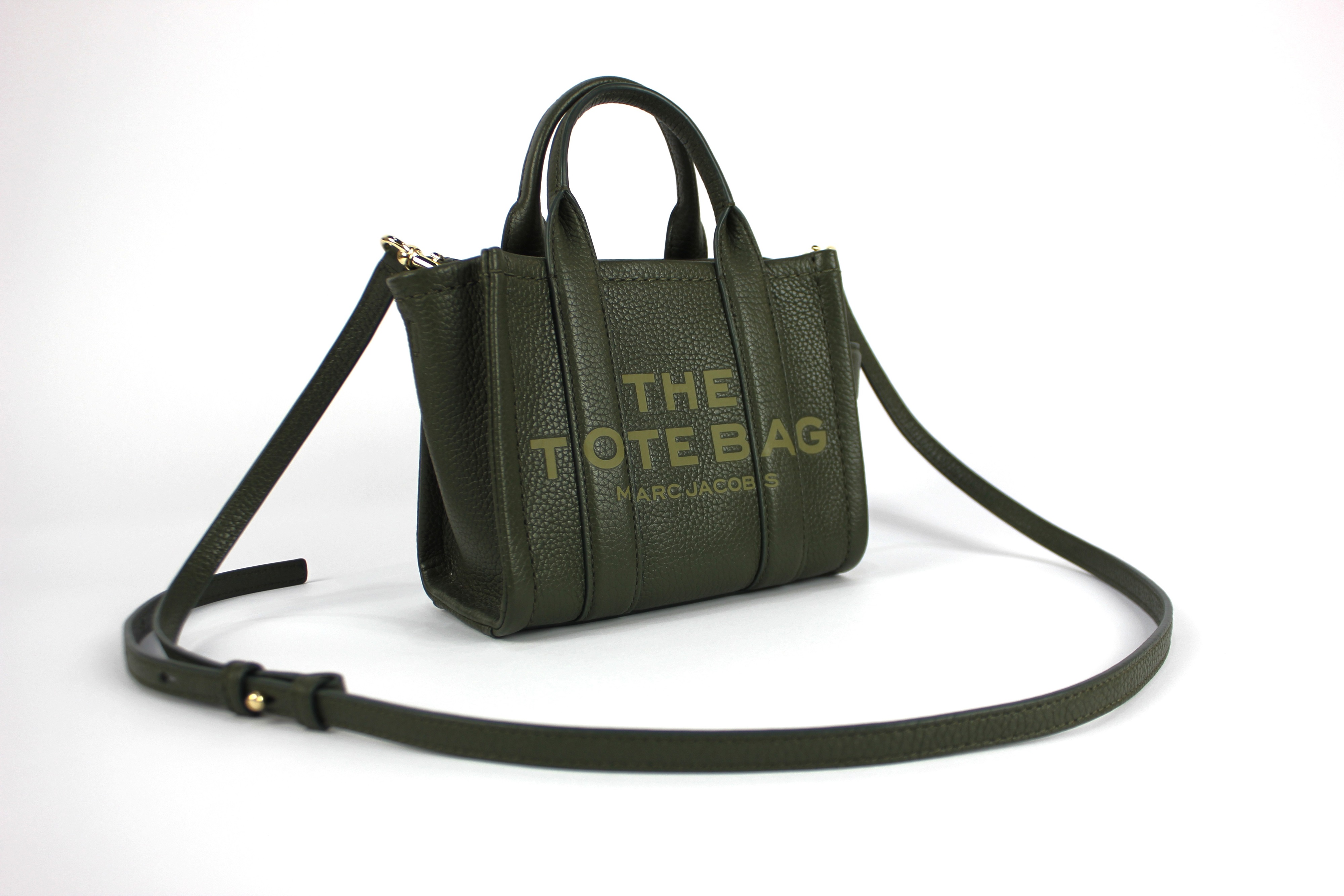 A Marc Jacobs miniature tote bag, 'The Tote Bag', in forest green, with gold tone hardware, two handles and long detachable strap, embossed branding, height 24cm