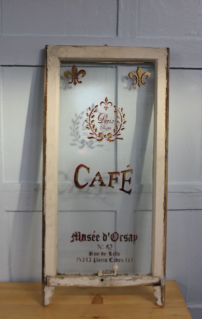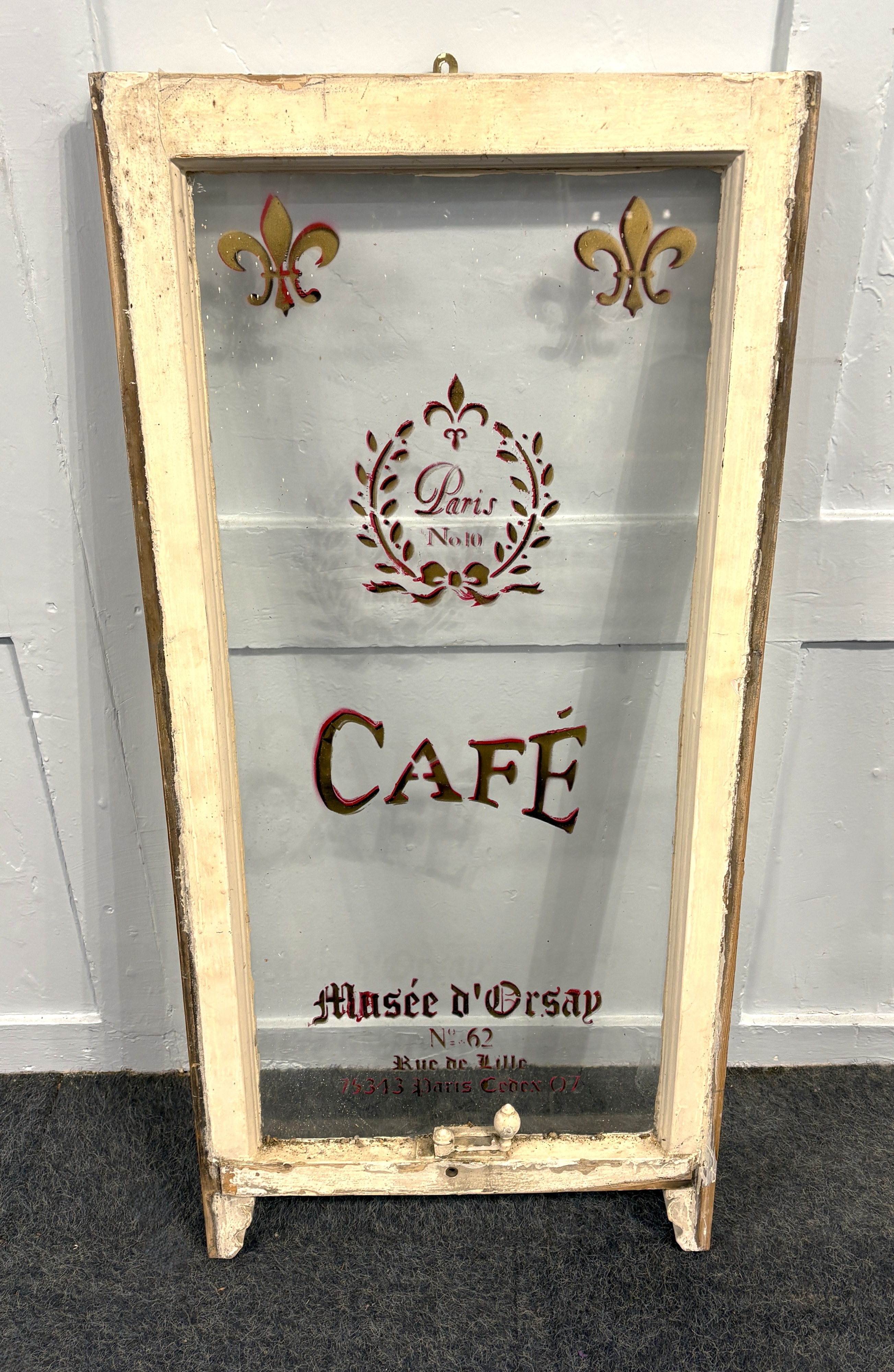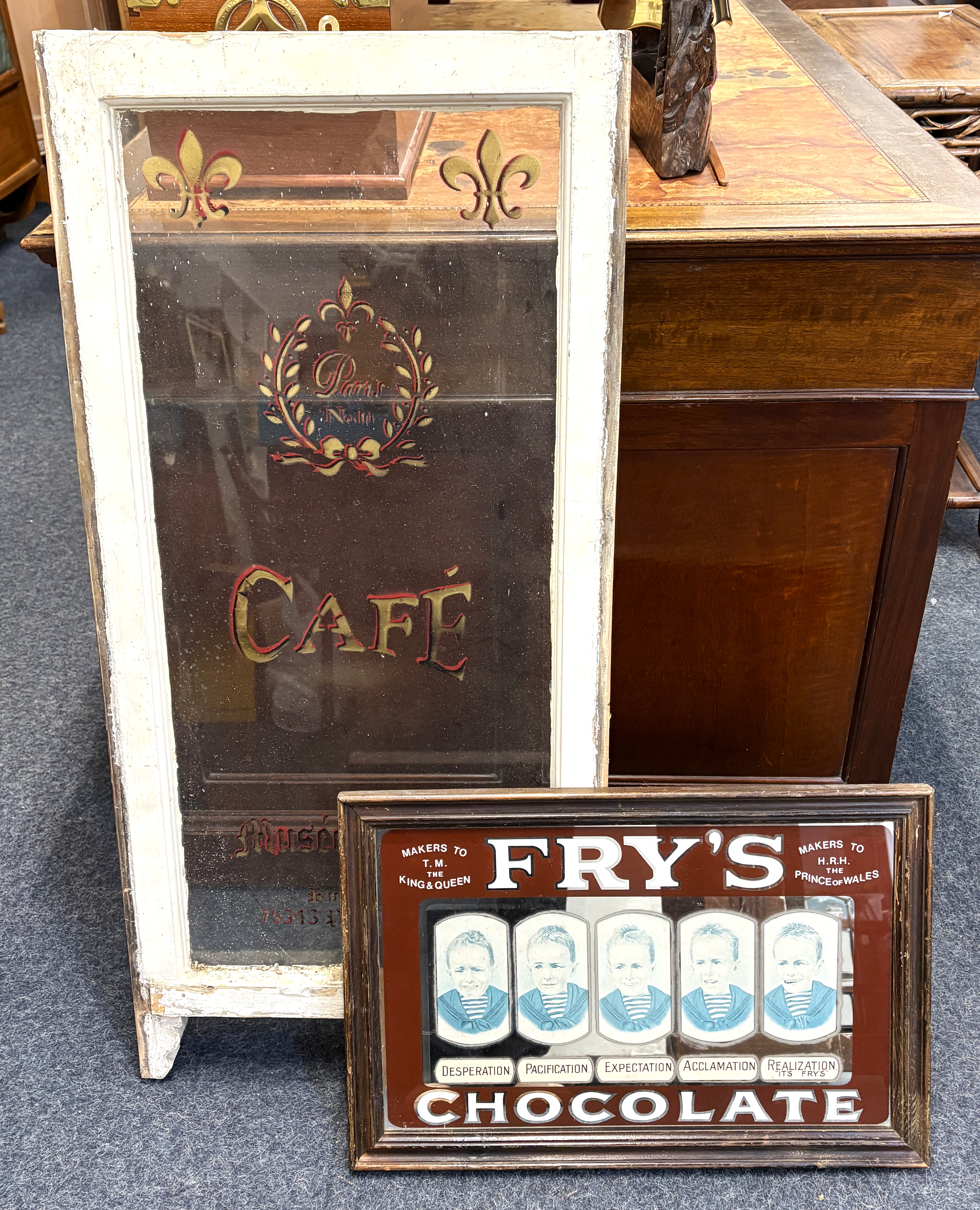A vintage French style window frame and pane, decorated to the glass 'Paris No. 10 Cafe, Musee d'Orsay', height 95.5cm (AF), together with an advertising mirror 'Fry's Chocolate', framed, 35cm by 53cm.
