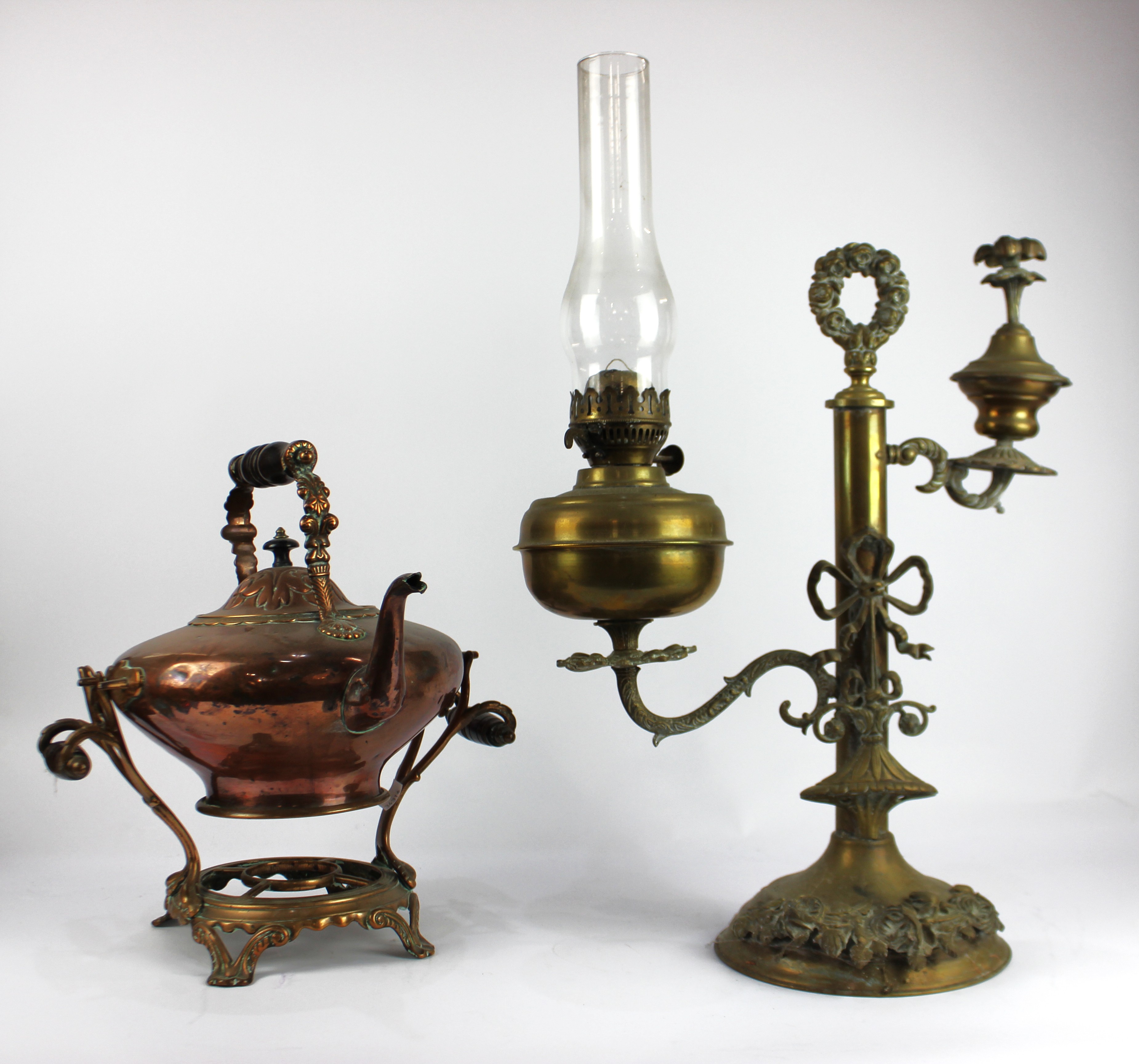 A Victorian oranate two branch oil lamp, Art Nouveau decorative elements, with glass chimney, height overall 63.5cm, together with a Victorian copper spirit kettle on stand, with turned wooden handles, height overall 37cm (2)