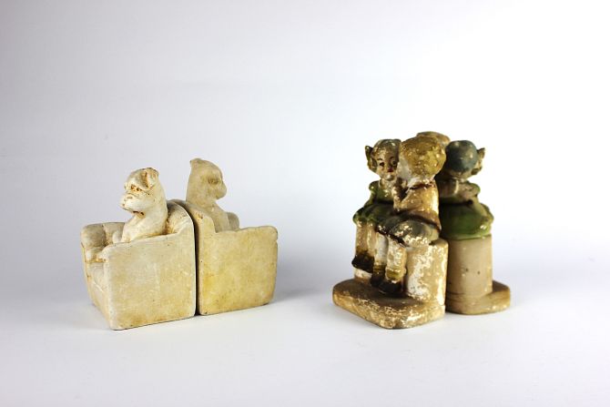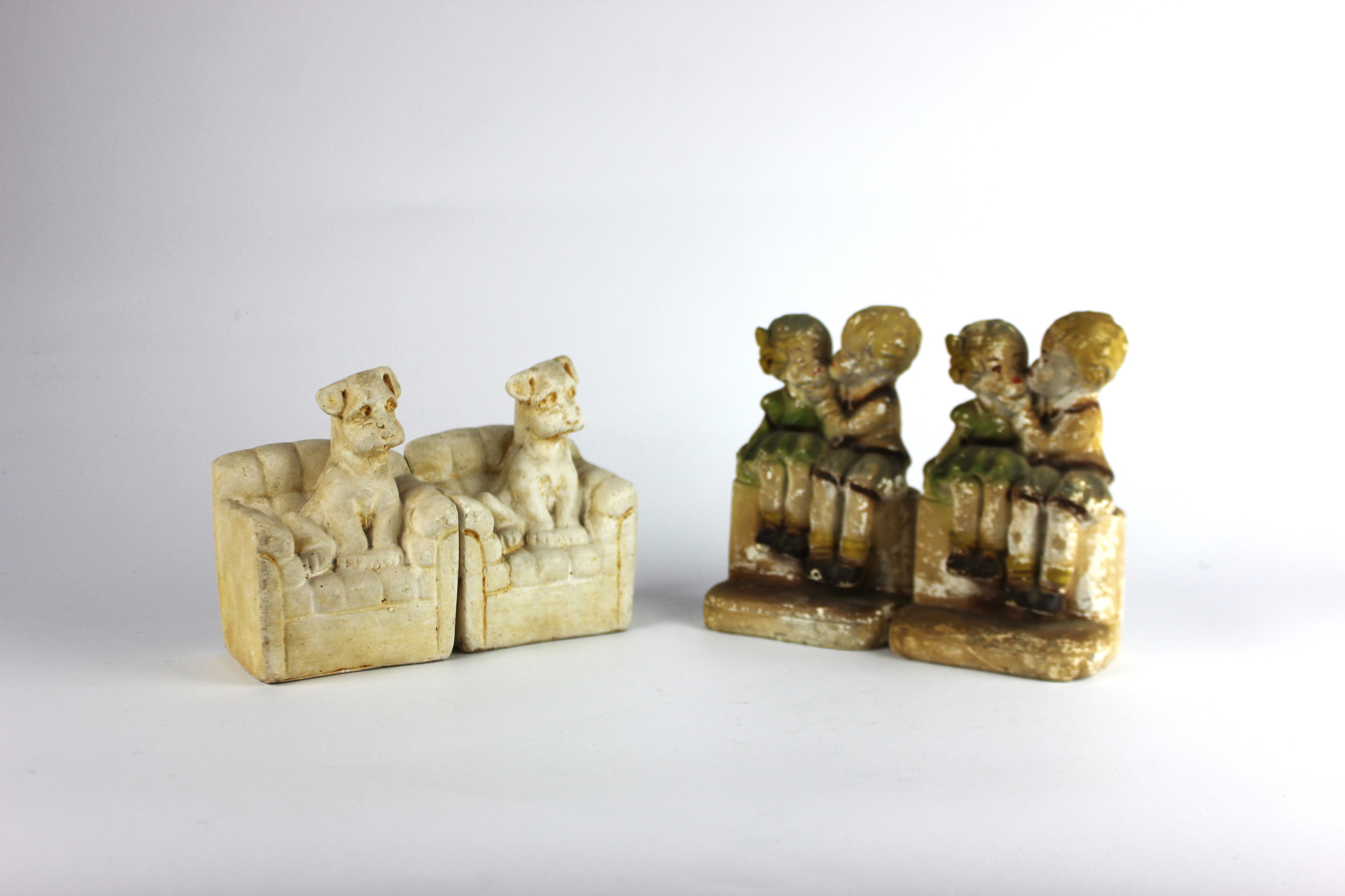 Two pairs of vintage plaster bookends, comprising one pair painted as two embracing children seated on a wall, 15cm high, the other unpainted and modelled as a terrier seated on an armchair 13cm high