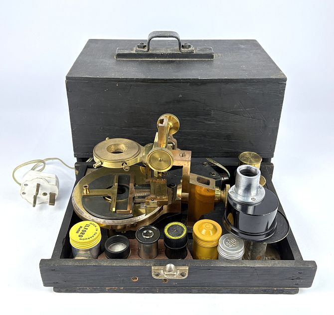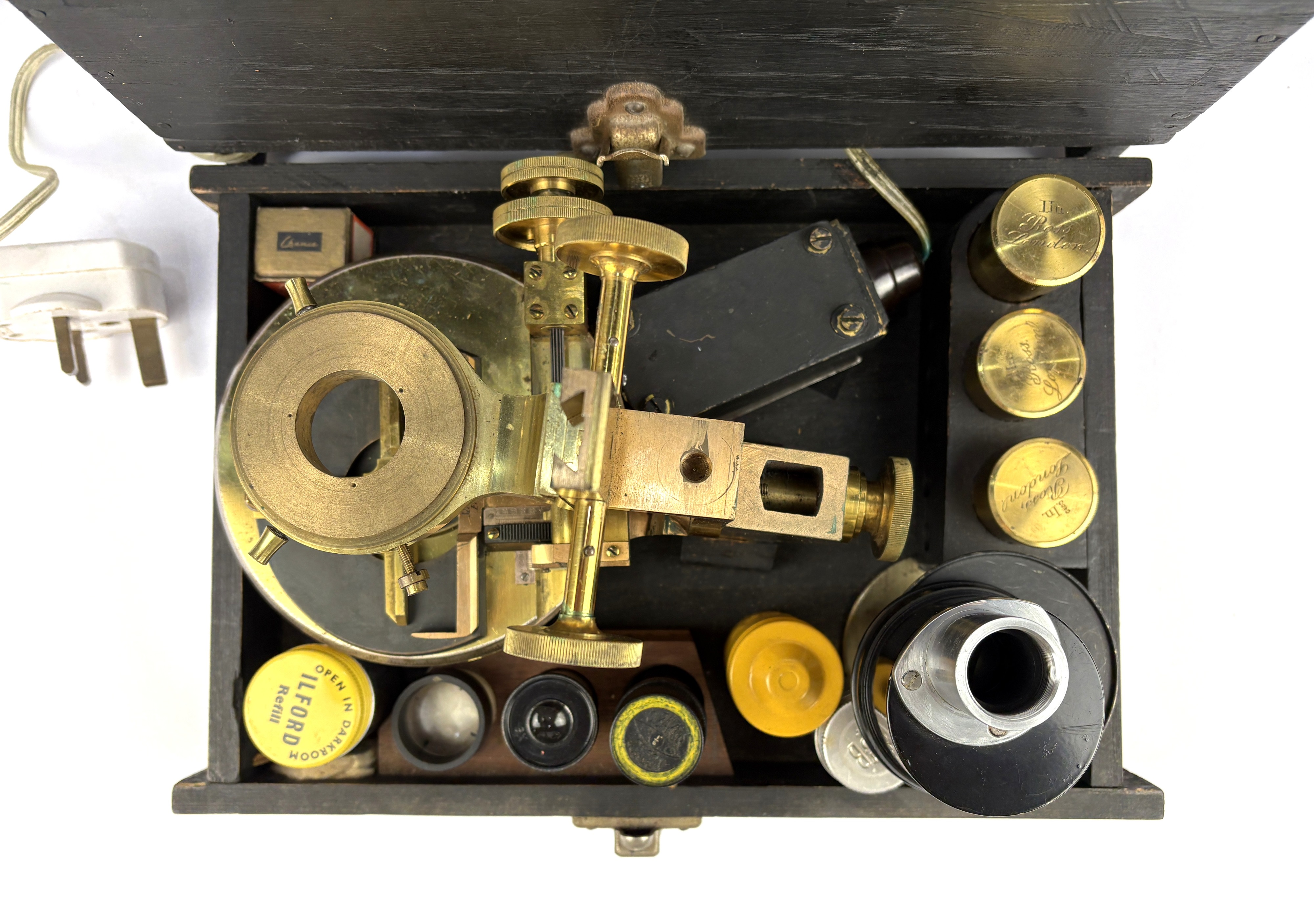 A 19th century cased brass scientific instrument engraved 'Maltwood Finder Patent', with three brass cased lens engraved 'Ross London' and associated items, in a wooden case (a/f)